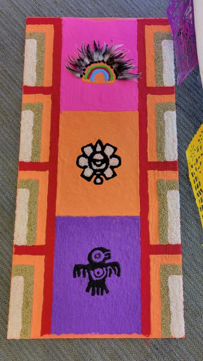 Extra Note: This year, I also enjoyed creating a Tapete for our Day of the Dead altar. The Tapete is a traditional mat made of colorful sawdust, flowers, seeds, feathers, fruits, or vegetables. This is a beautiful, ephemeral artform where a large section of the floor (usually in front of Day of the Dead altar) is decorated and after the festivities, it is swept away.
