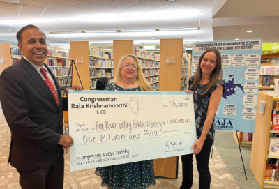 EAST DUNDEE, IL – On July 16, Congressman Raja Krishnamoorthi (D-IL) presented the Fox River Valley Public Library System with one million dollars in federal funding he secured through bipartisan legislation to help upgrade its facilities at the East Dundee Public Library building. The renovation will bring the building into compliance with the Americans with Disabilities Act (ADA) while also making general site improvements.