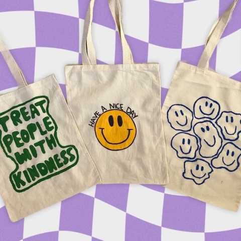Customize your own re-usable tote. Use fabric paint with stencils, or free hand your own design.