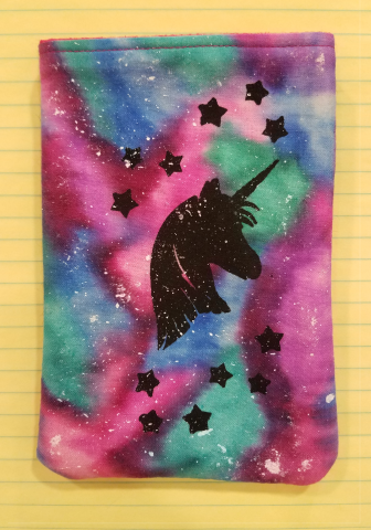 Use Sharpie Markers, cotton fabric and rubbing alcohol to create your own galaxy print. THen use our sewing machines to quickly sew it into a pouch. Finish it off with a painted on decal using a stencil created by our Silhouette machine.