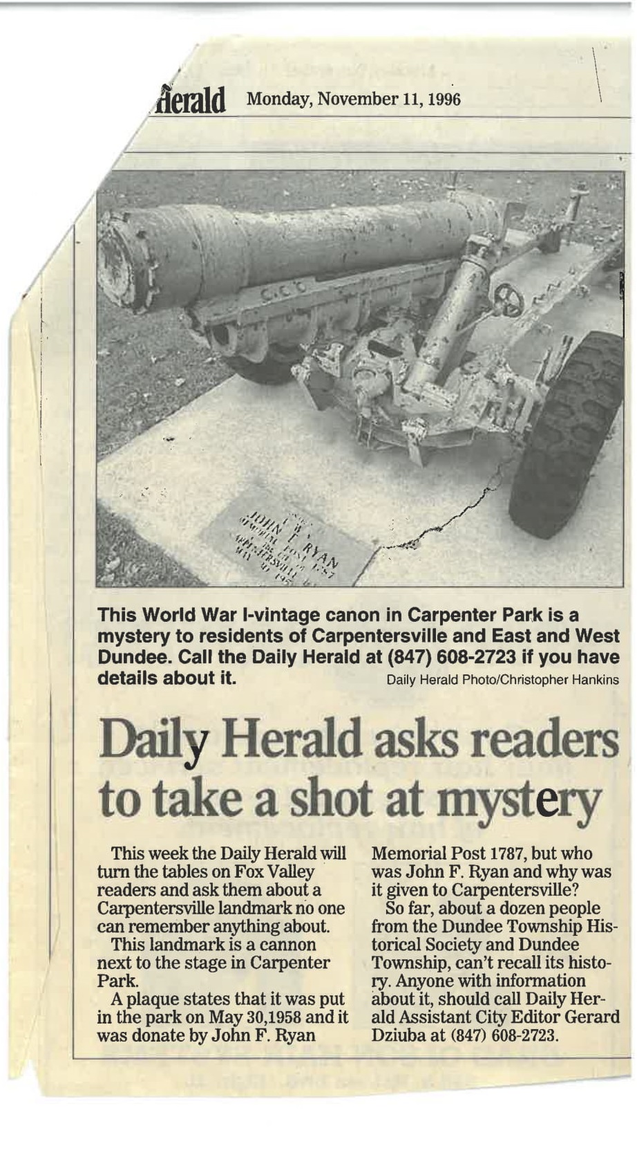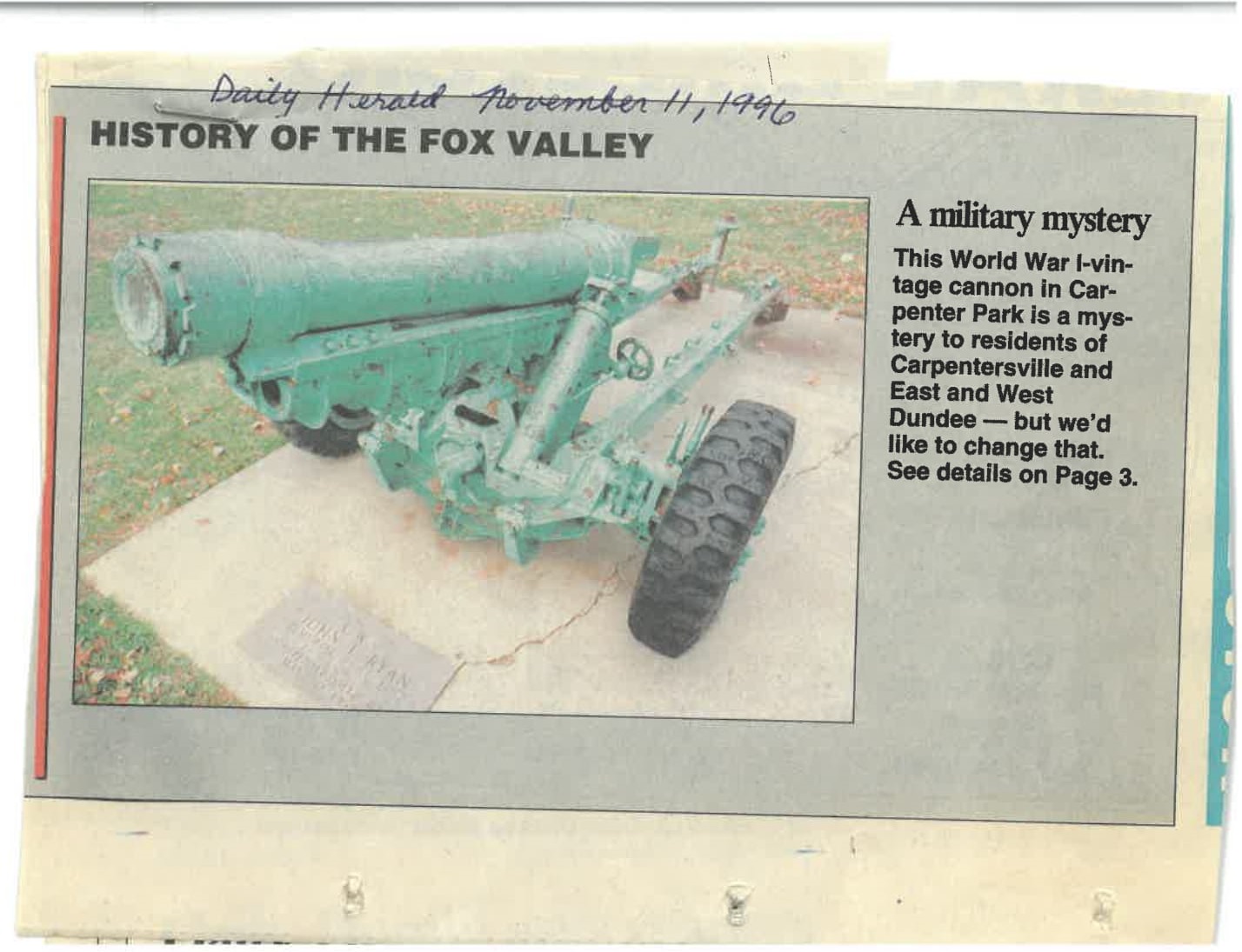 - Article about the World War I vintage canon in Carpenter Park, Daily Herald, November 11, 1996