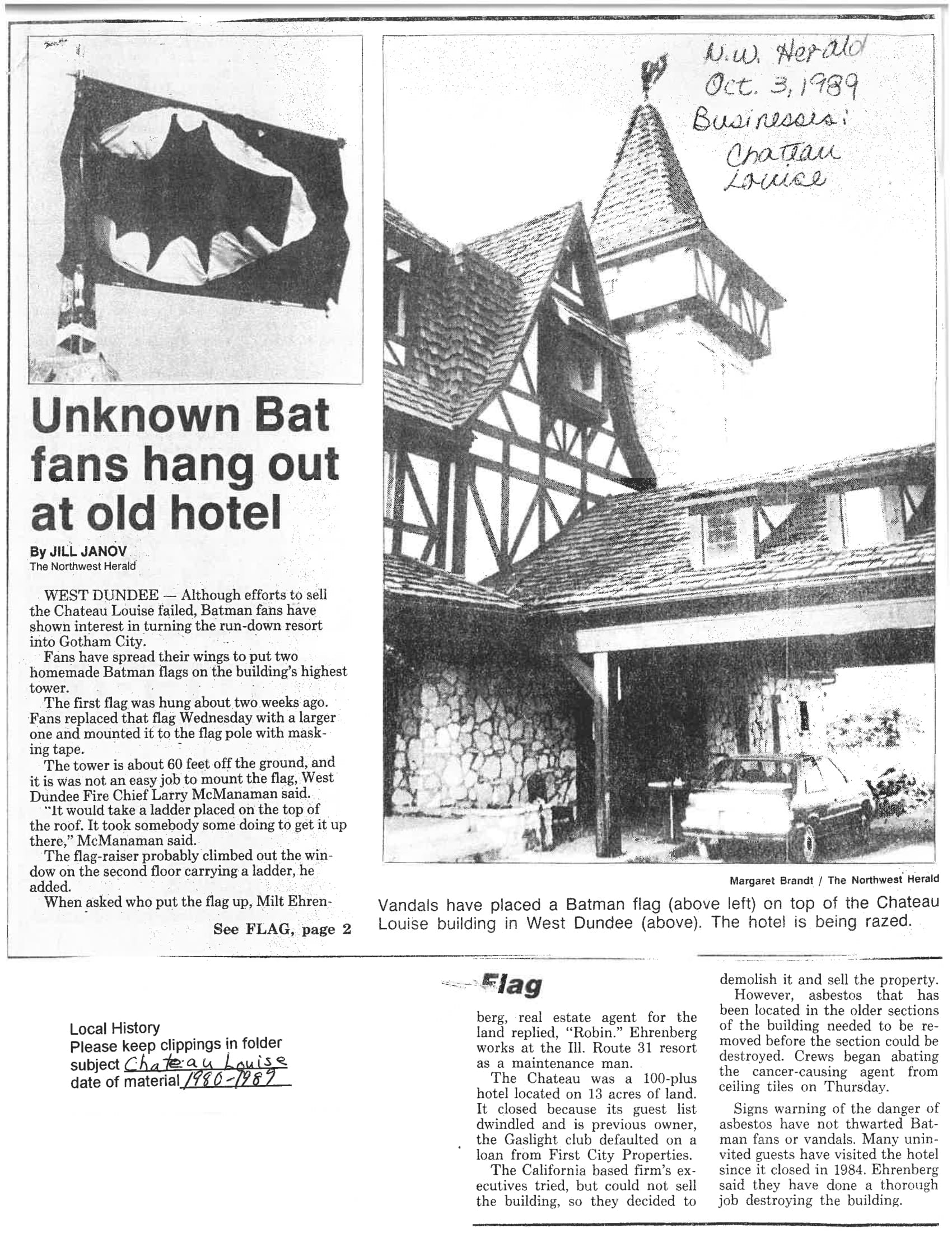“Unknown Bat Fans Hang Out at Old Hotel” article, Northwest Herald, October 3, 1989