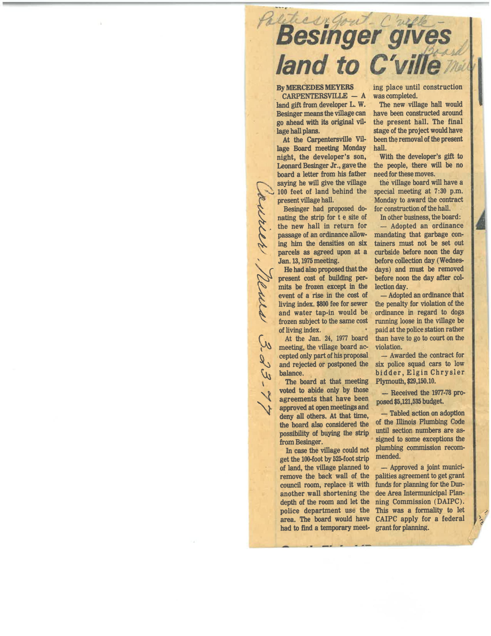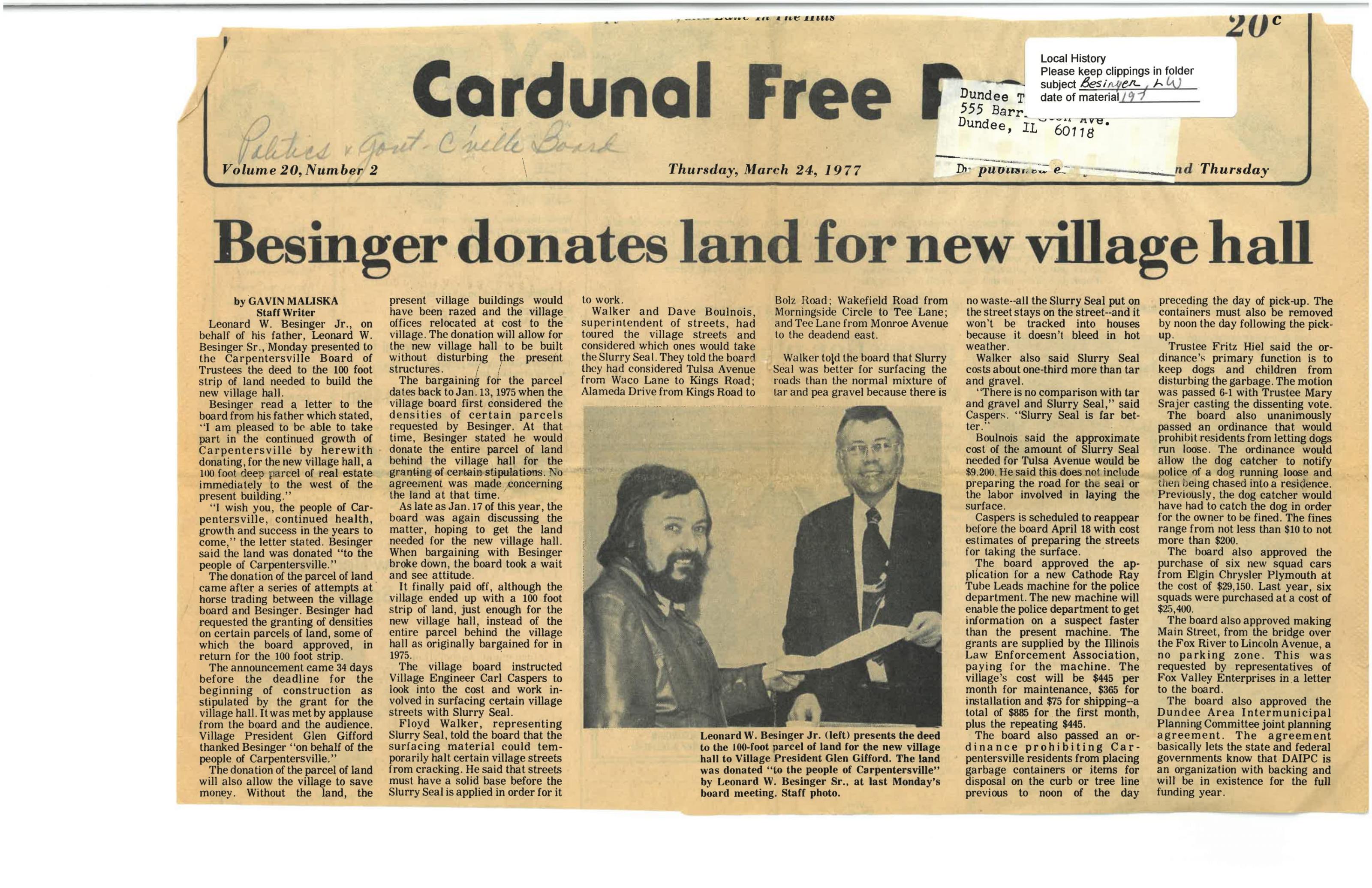 “Besinger Donates Land For New Village Hall”, Cardunal Free Press, March 24, 1977