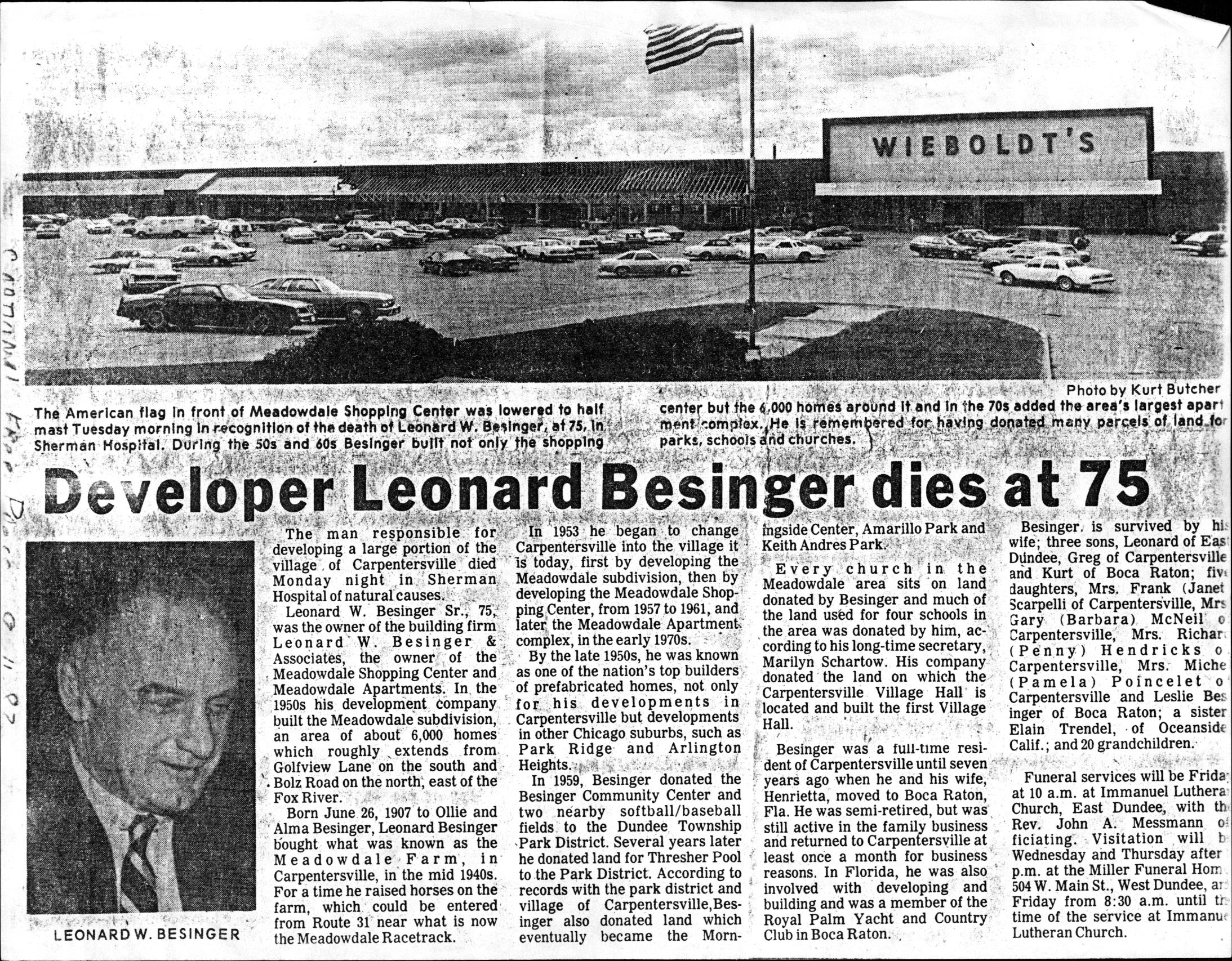 “Developer Leonard Besinger Dies at 75”, Cardunal Free Press, August 11, 1982