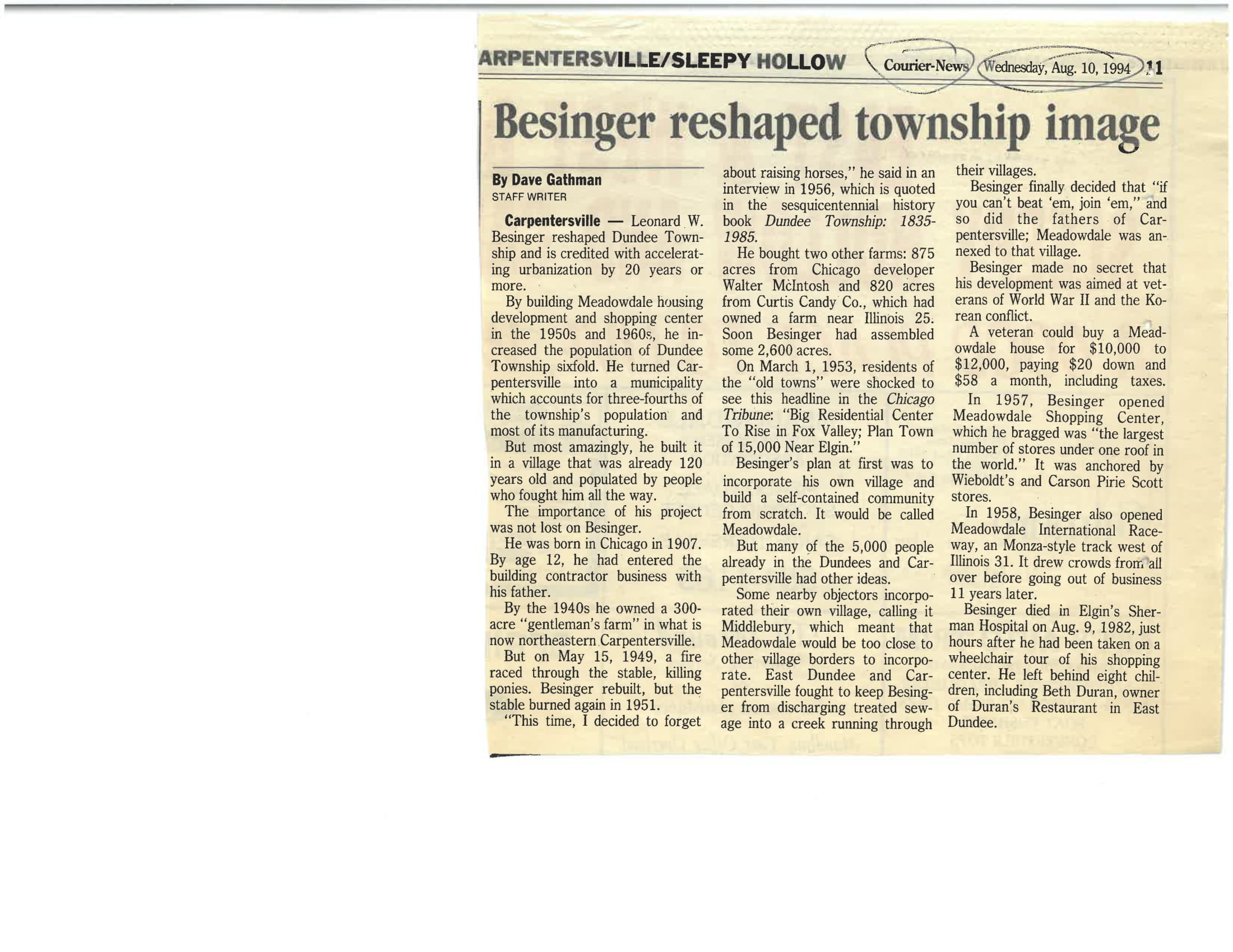 “Besinger Reshaped Township Image”, Courier News, August 10, 1994