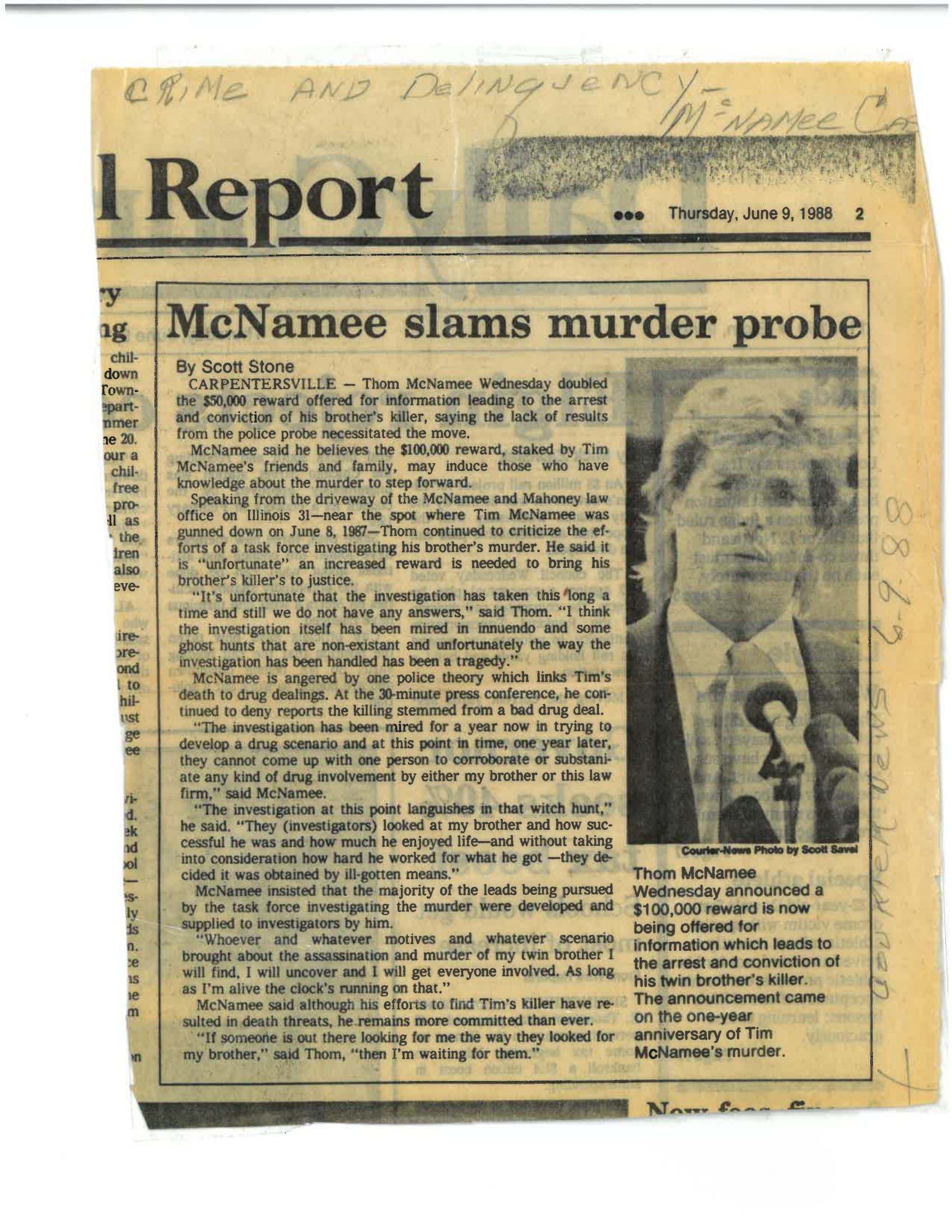 “McNamee Slams Murder Probe”, Courier News, June 9, 1988