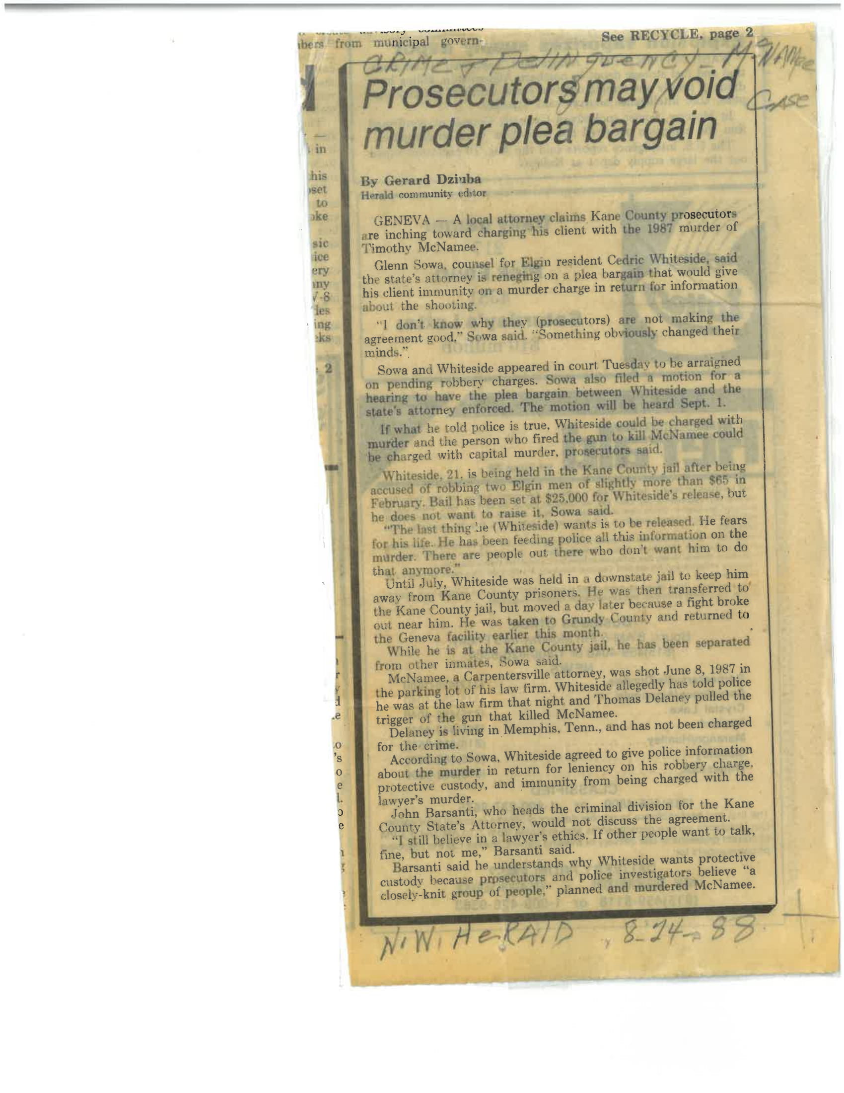 “Prosecutors May Void Murder Plea Bargain” , Northwest Herald, August 24, 1988