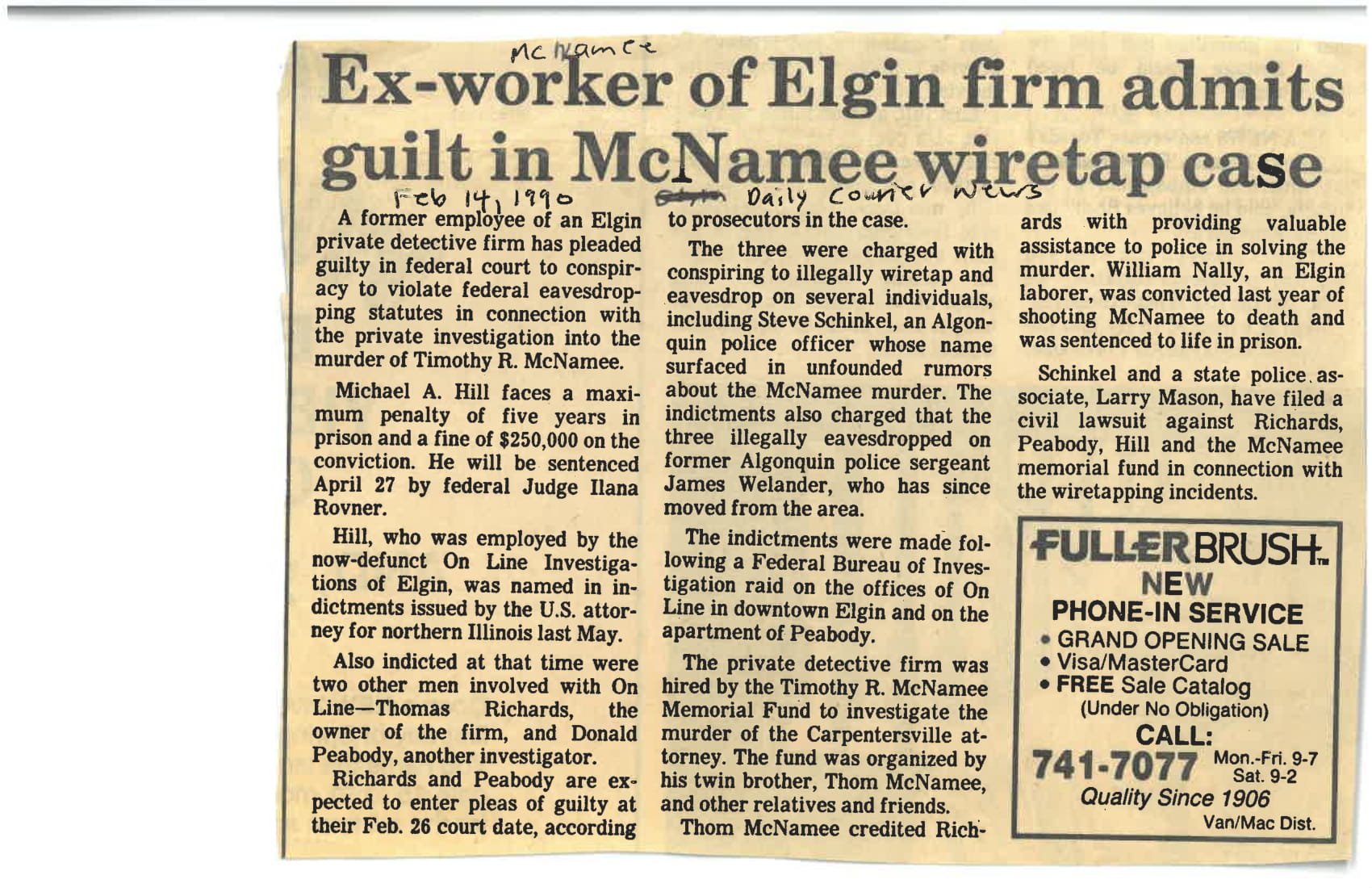 “Ex-Worker of Elgin Firm Admits Guilt in McNamee Wiretap Case”, Courier News, February 14, 1990