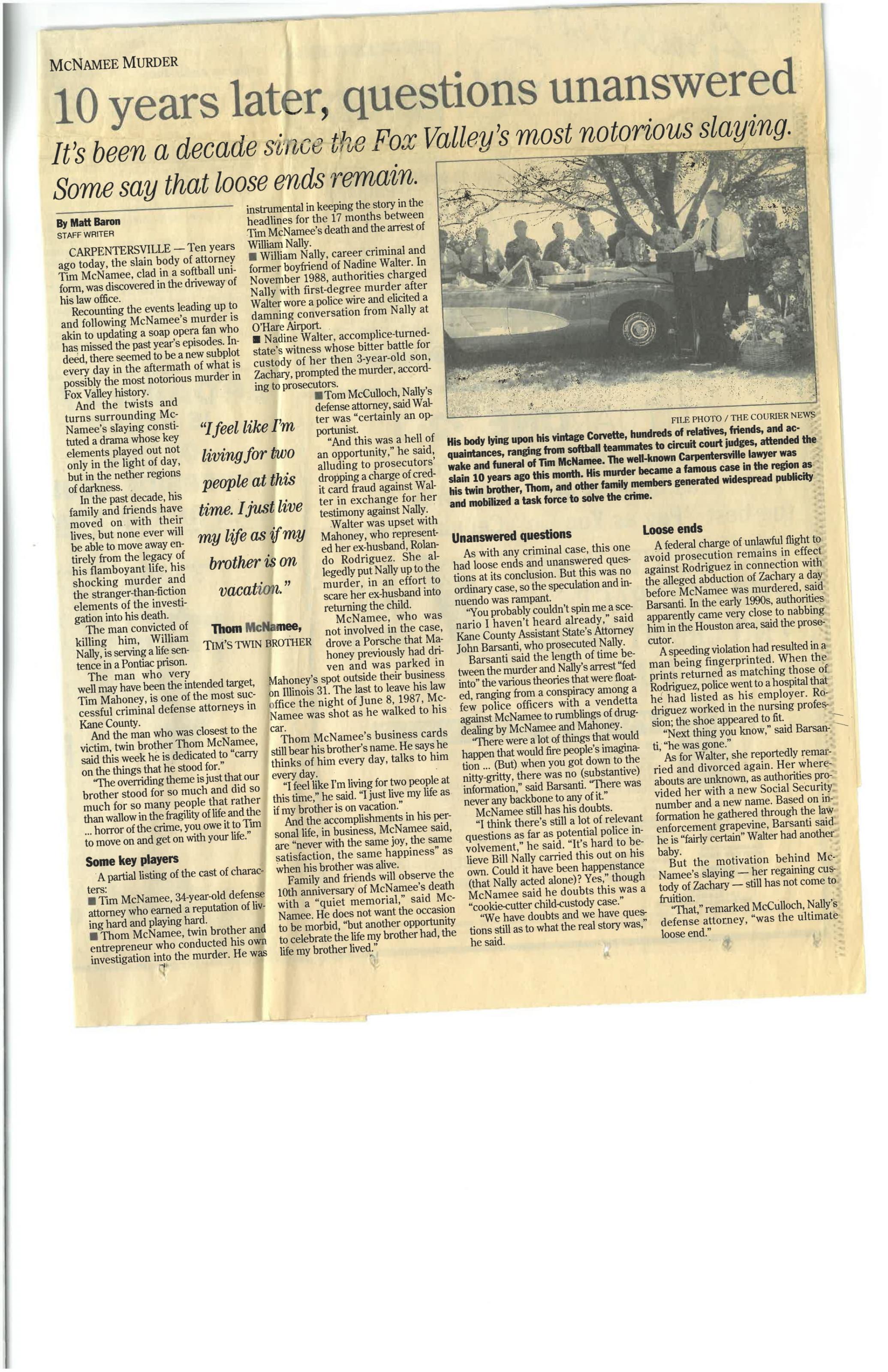 This collection contains articles pertaining to the murder investigation of Timothy McNamee. Timothy McNamee was an attorney in West Dundee and he was shot and killed on June 8th, 1987. The content in this collection ranges from 1987 to 1997.