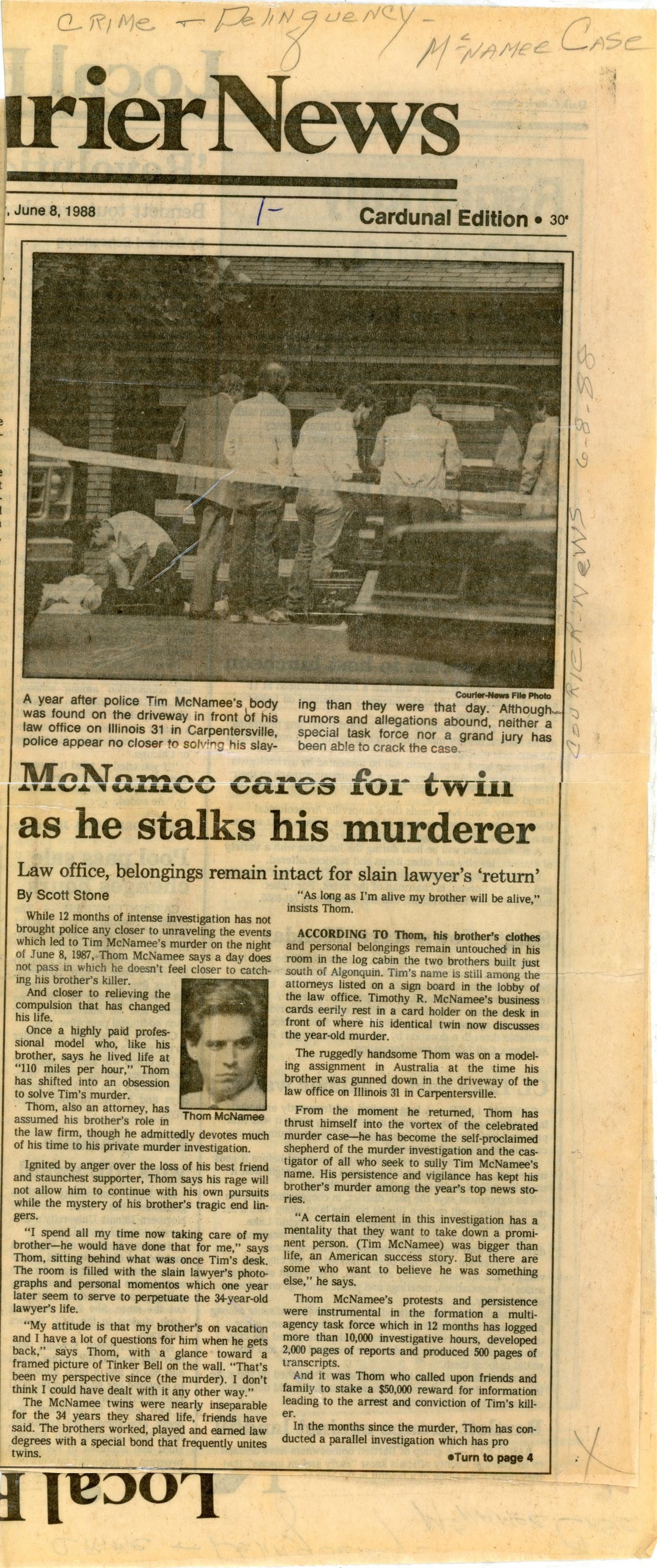“McNamee Cares for Twin as He Stalks His Murderer”, Courier News, June 8, 1988