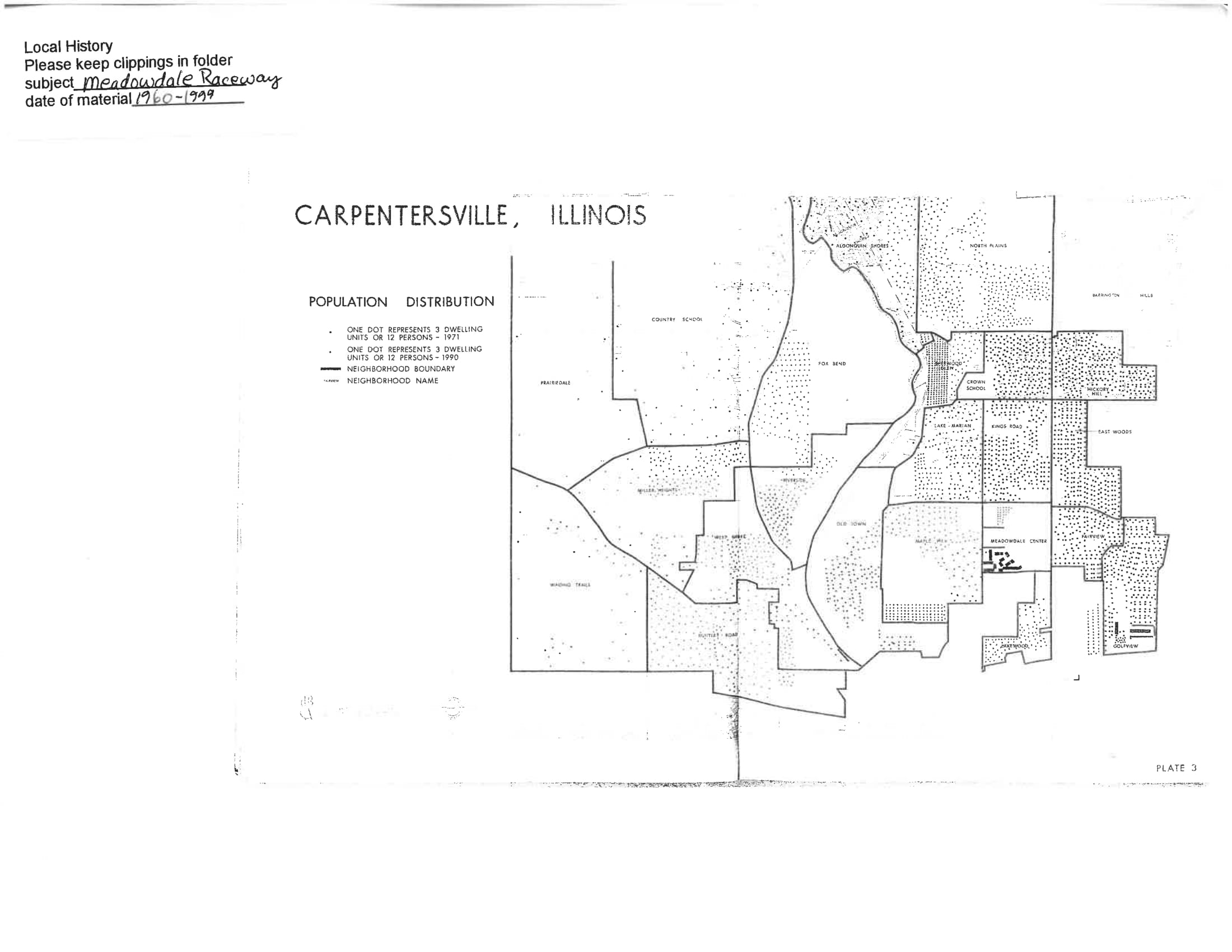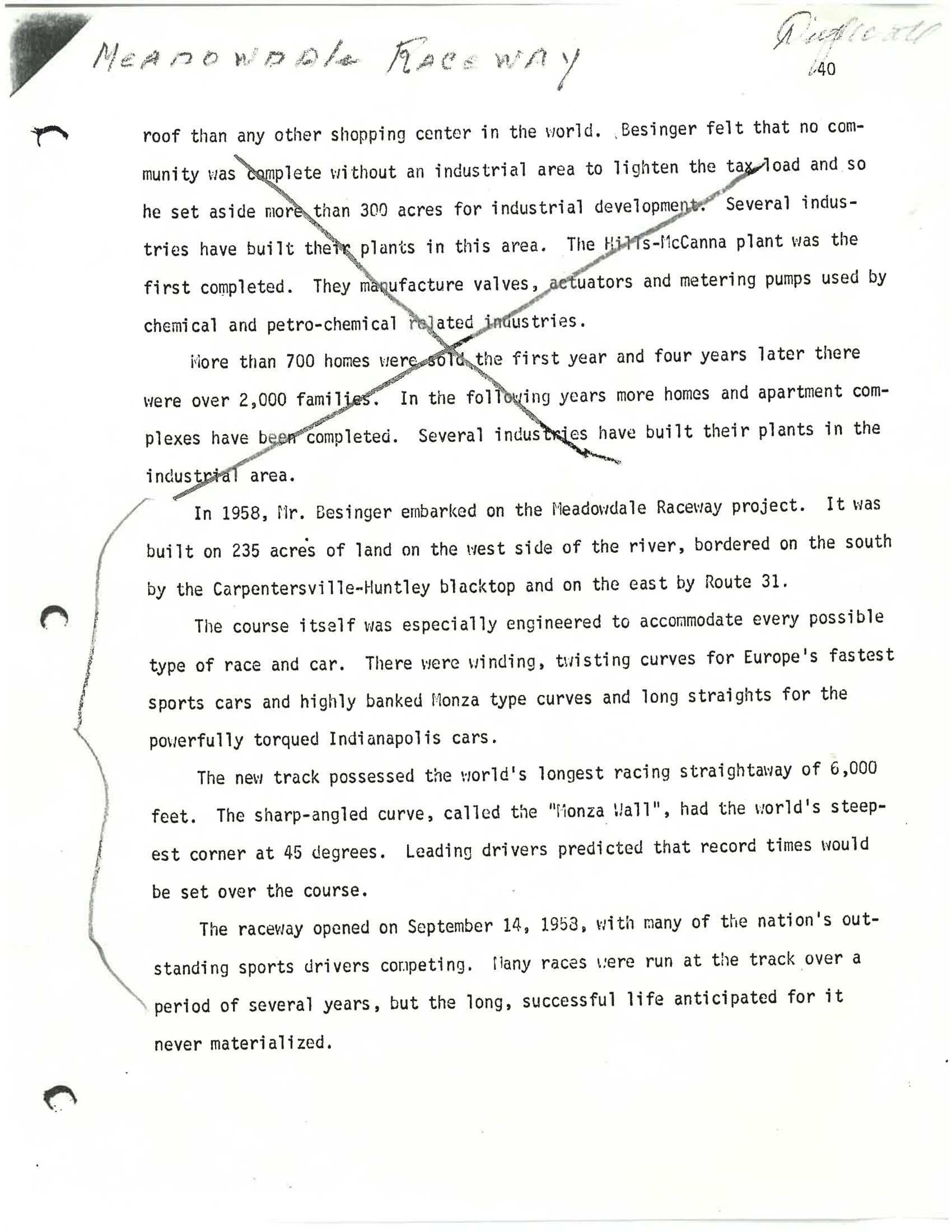 This collection is made up of articles, documents, pictures, photocopied pages of books, and more all pertaining to the history of Meadowdale Raceway. Meadowdale Raceway was a race track in Carpentersville that was used for motor racing from 1958 to 1968. The content in this collection ranges from 1958 to 2007.