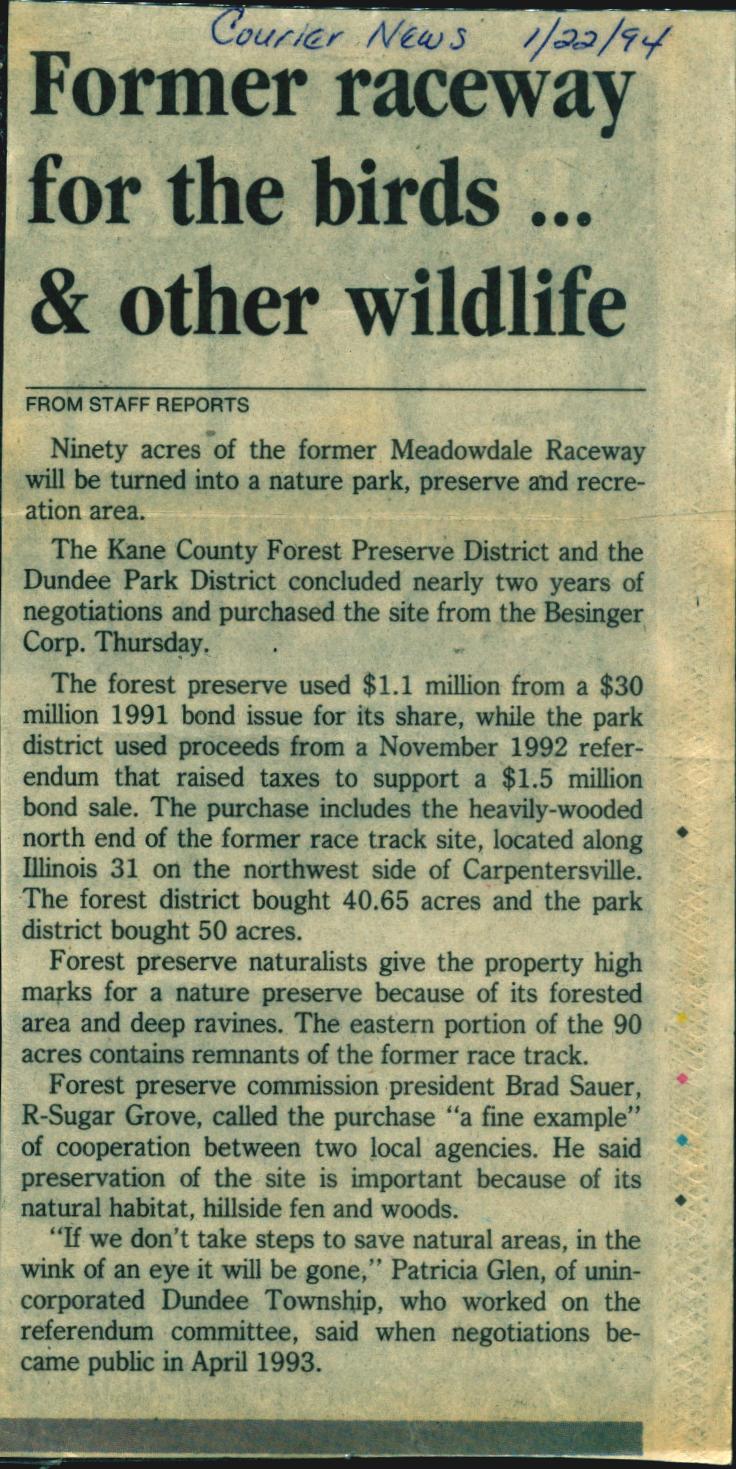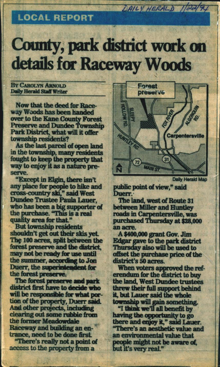 “County, Park District Work on Details for Raceway Woods”, Daily Herald, January 22, 1994