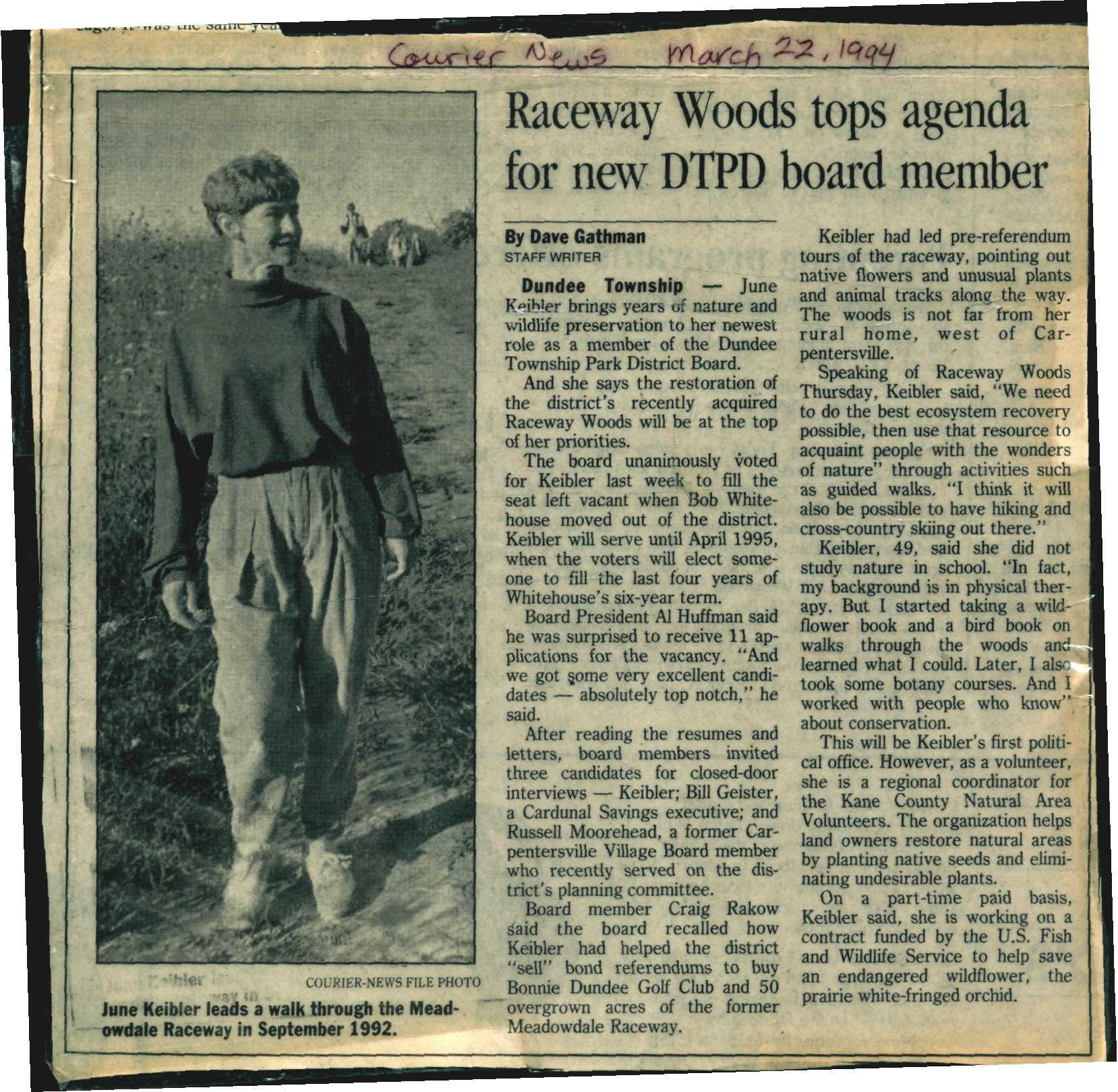 “Raceway Woods Tops Agenda for New DTPD Board Member”, Courier News, March 22, 1994