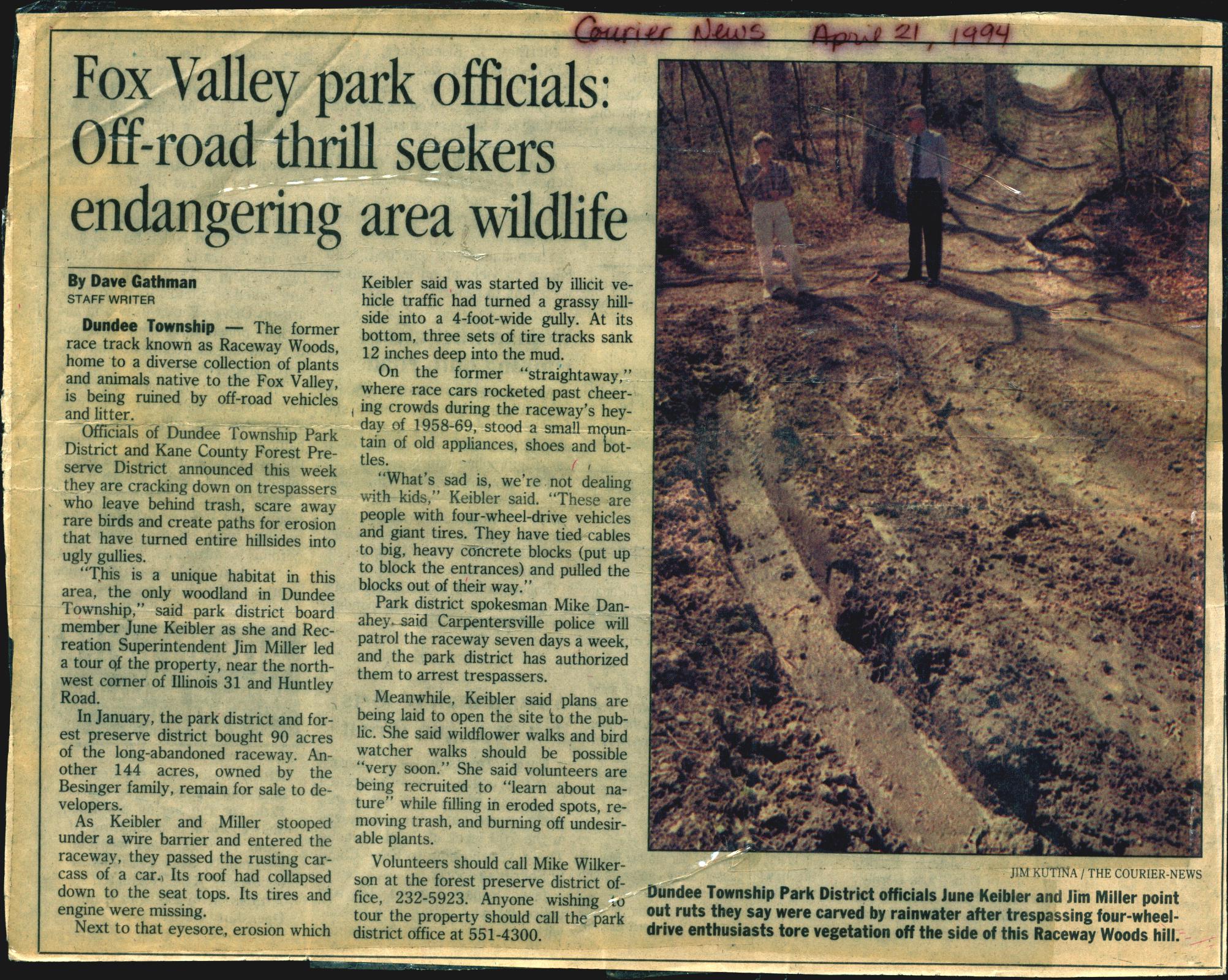 “Fox Valley Park Officials: Off-road Thrill Seekers Endangering Area Wildlife”, Courier News, April 21, 1994