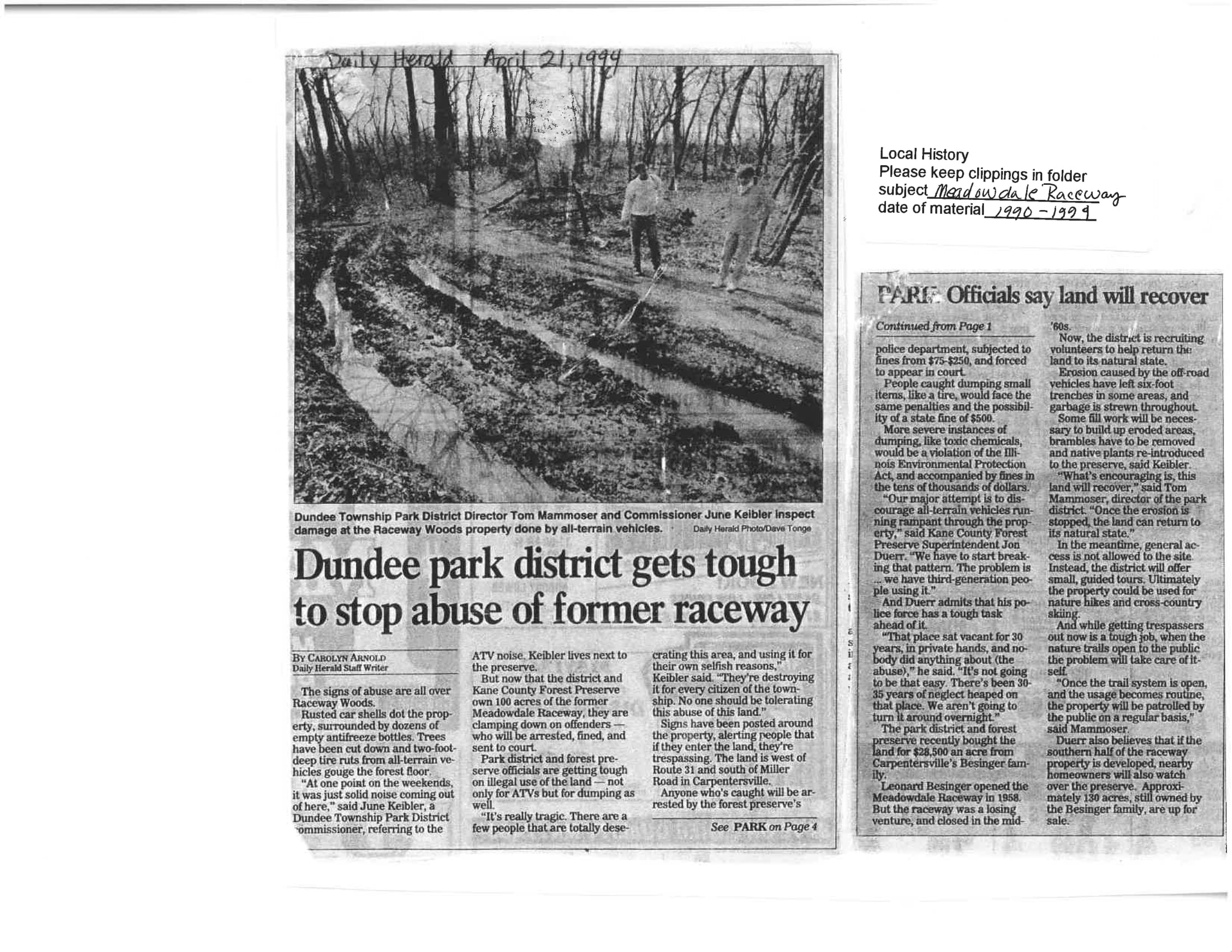 “Dundee Park District Gets Tough to Stop Abuse of Former Raceway”, Daily Herald, April 21, 1994