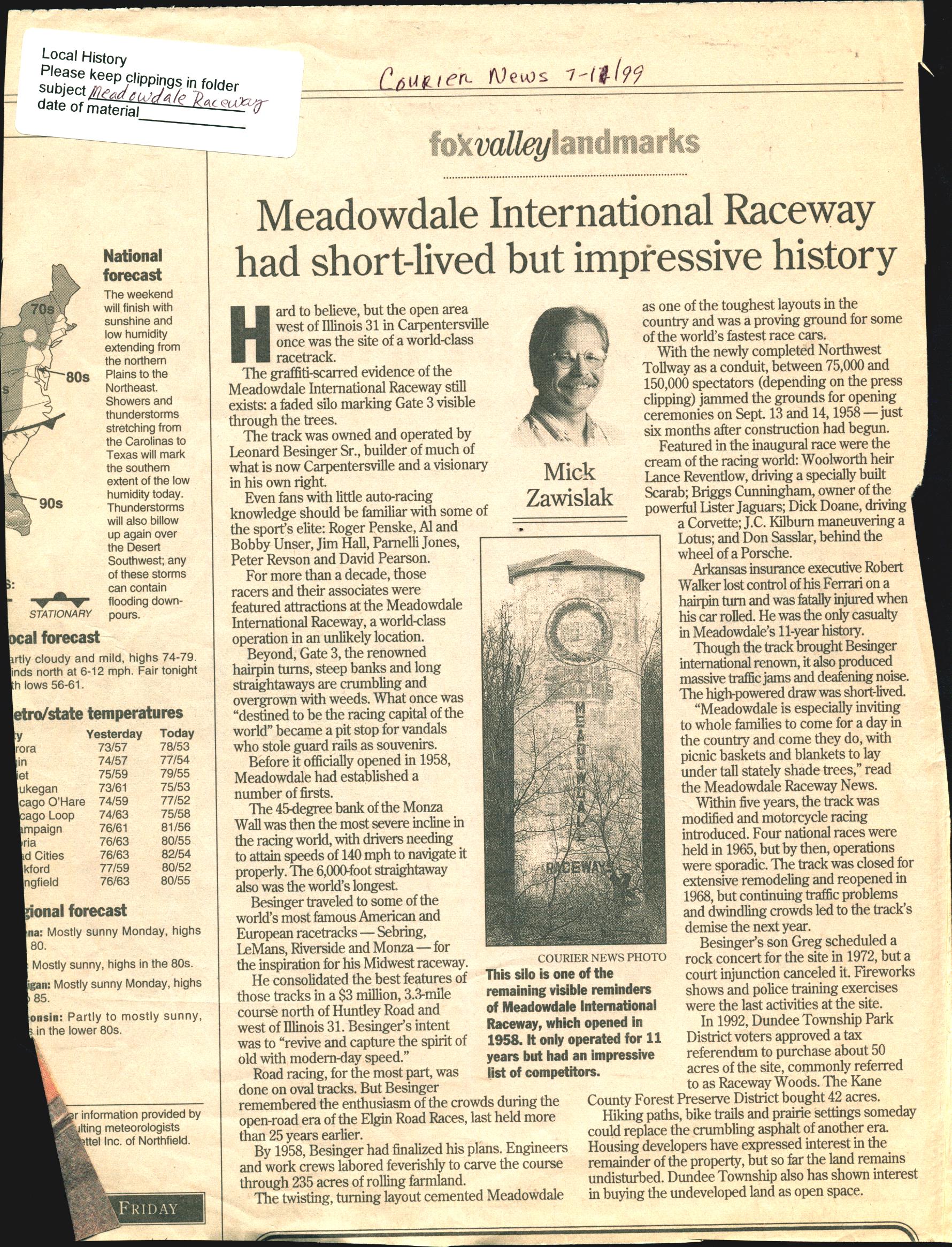 “Meadowdale International Raceway Had Short-lived but Impressive History”, Courier News, July 11, 1999