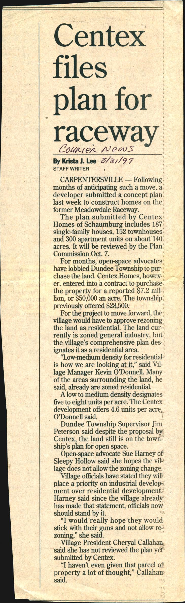 “Centex Files Plan for Raceway”, Courier News, August 31, 1999