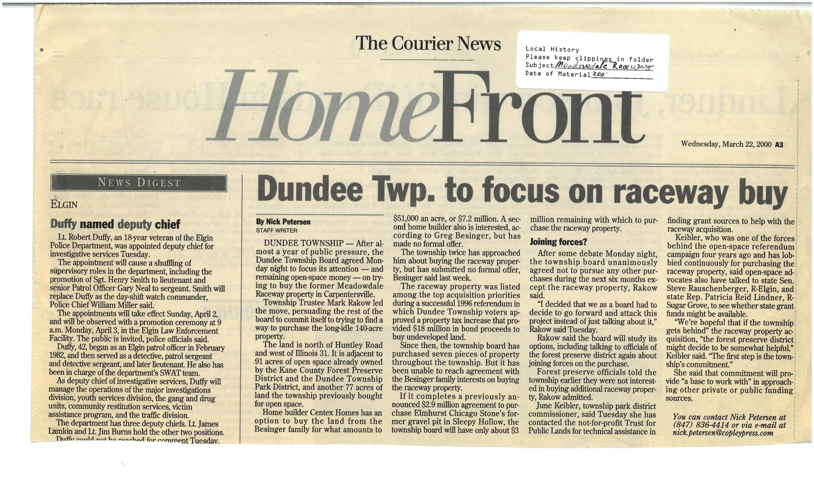 “Dundee Twp. to Focus on Raceway Buy”, Courier News, March 22, 2000