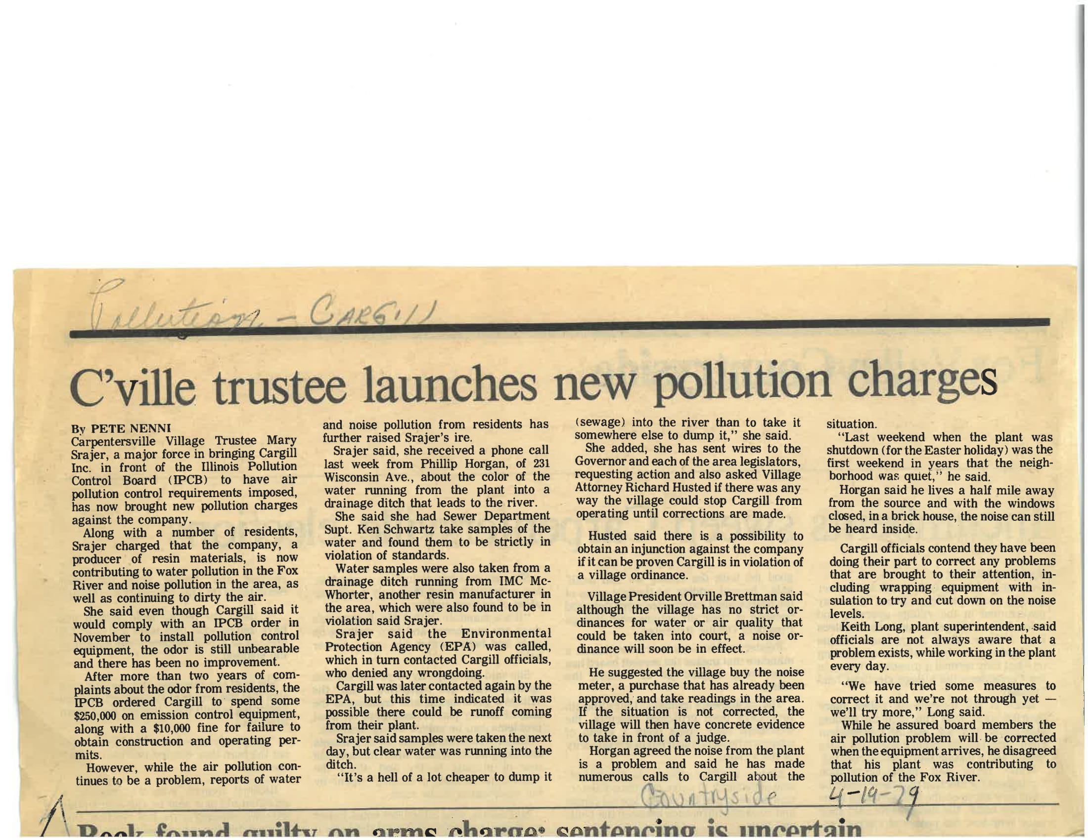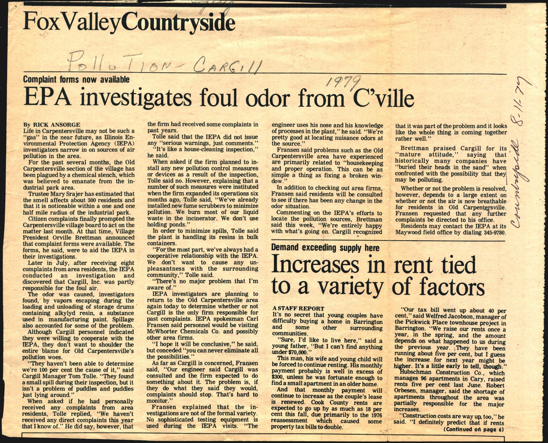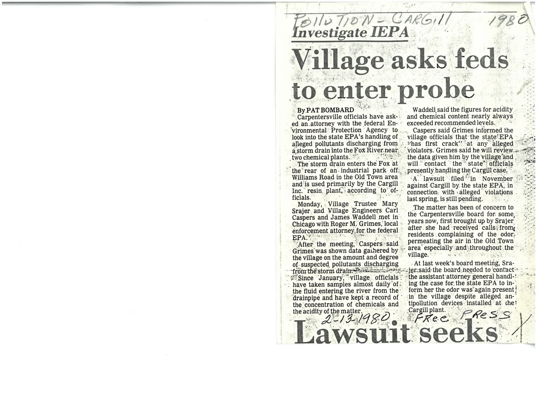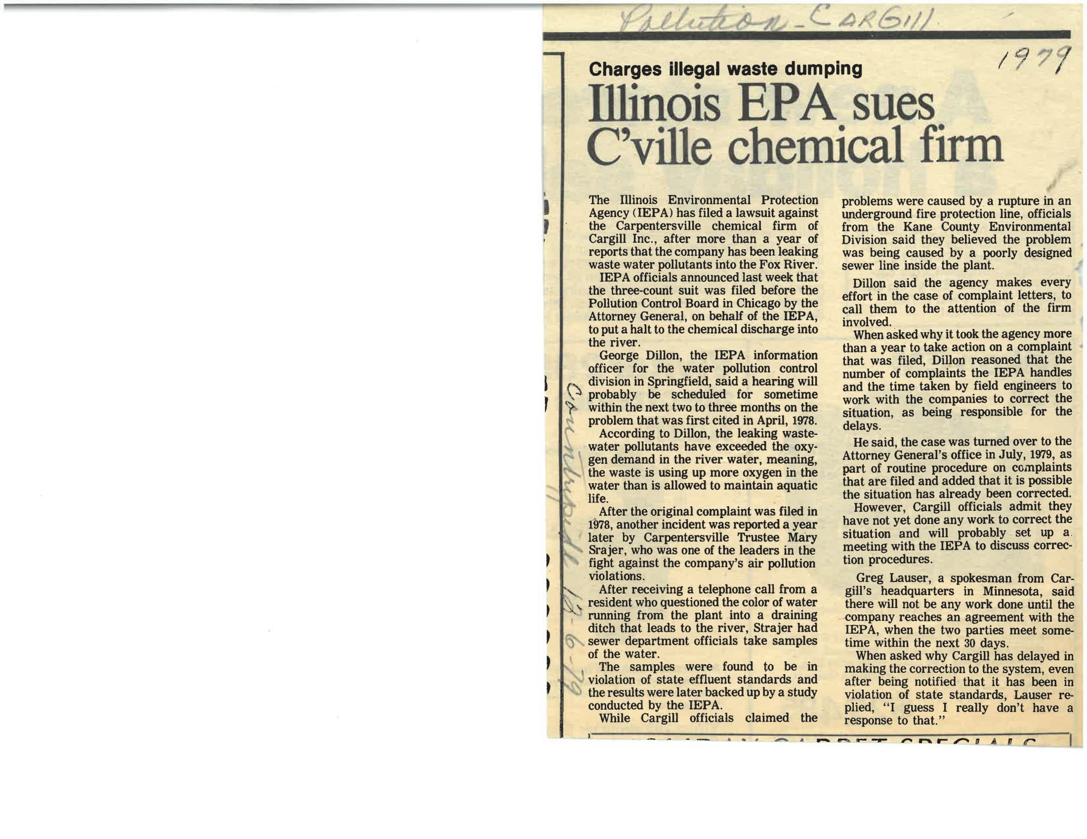 - “C’ville Claims IEPA Inaction in Cargill Case”, Fox Valley Countryside, February 21, 1980