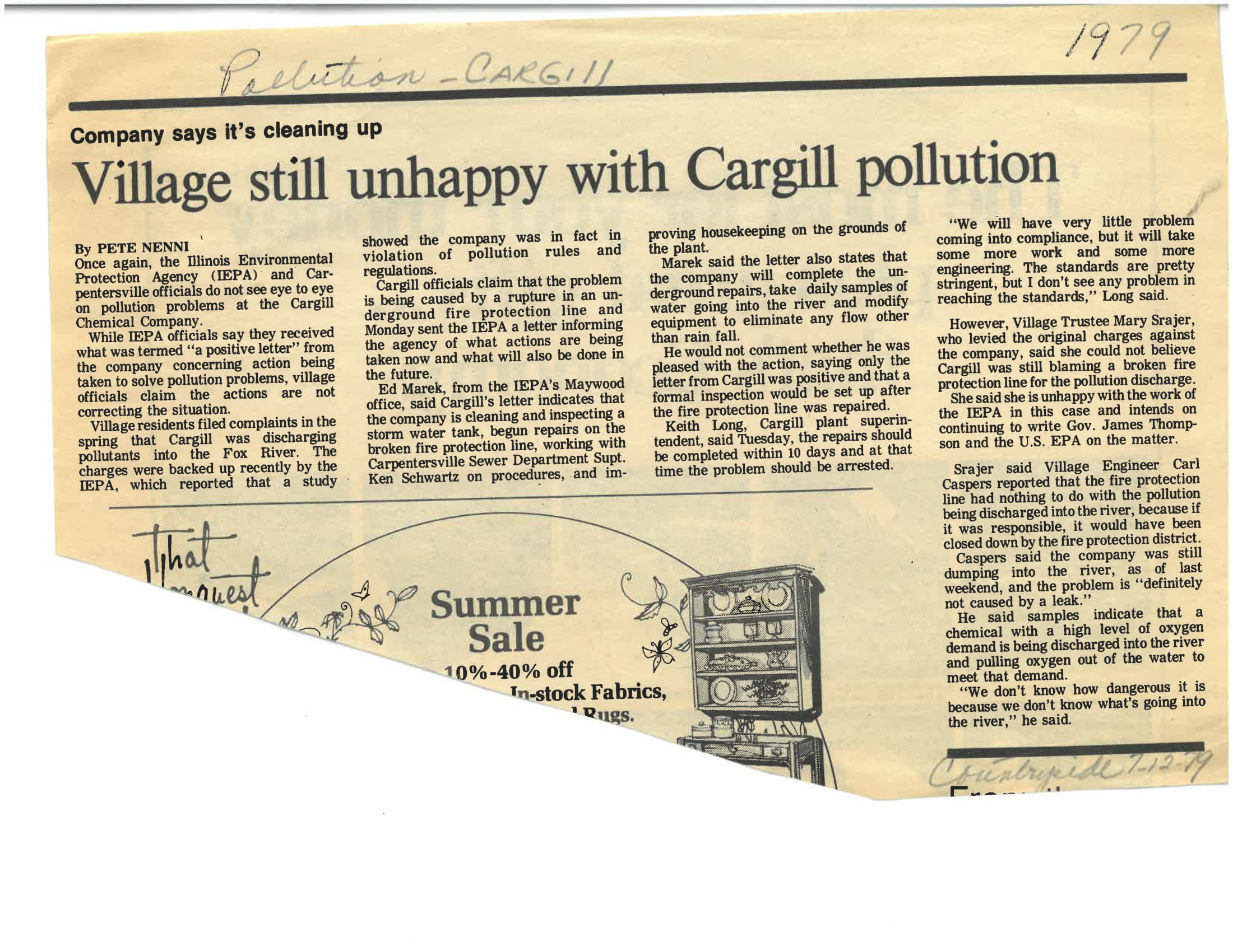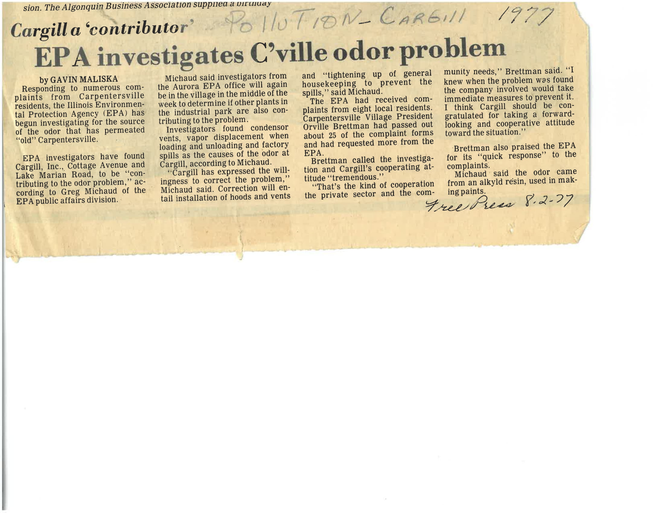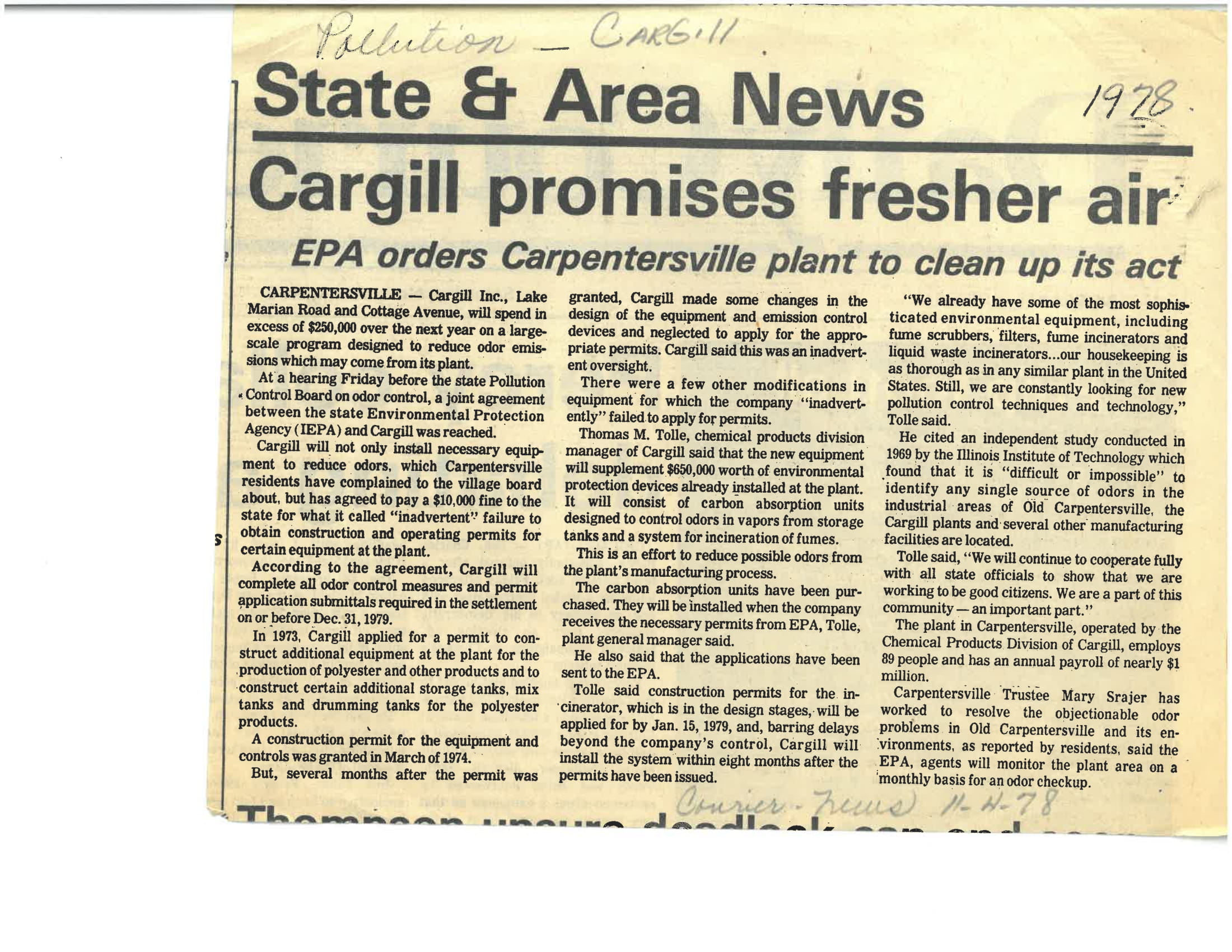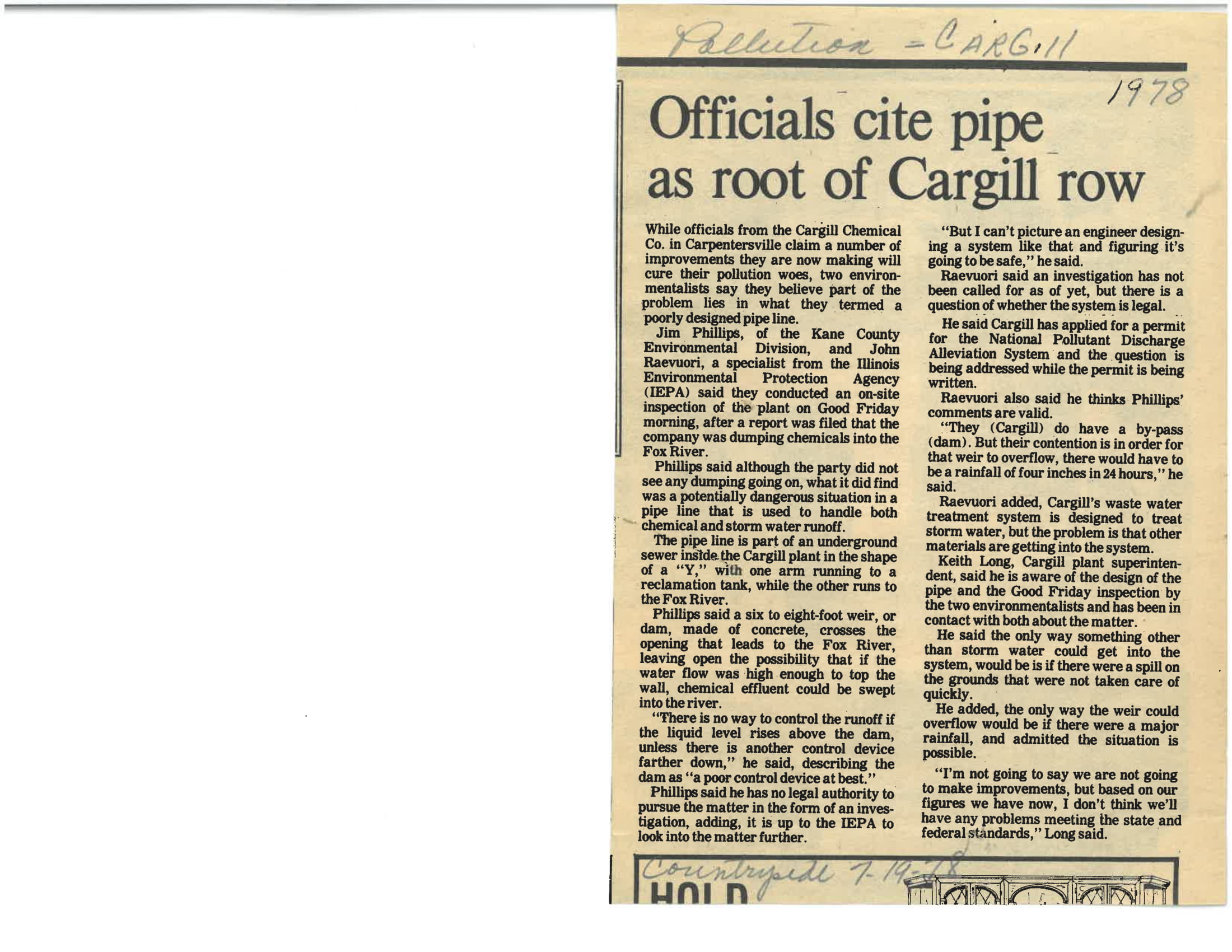 - “C’ville Claims IEPA Inaction in Cargill Case”, Fox Valley Countryside, February 21, 1980