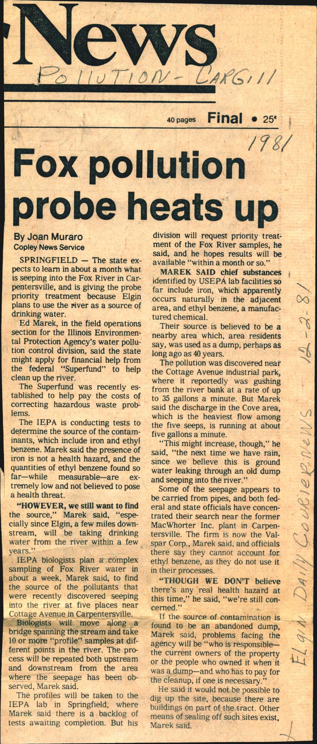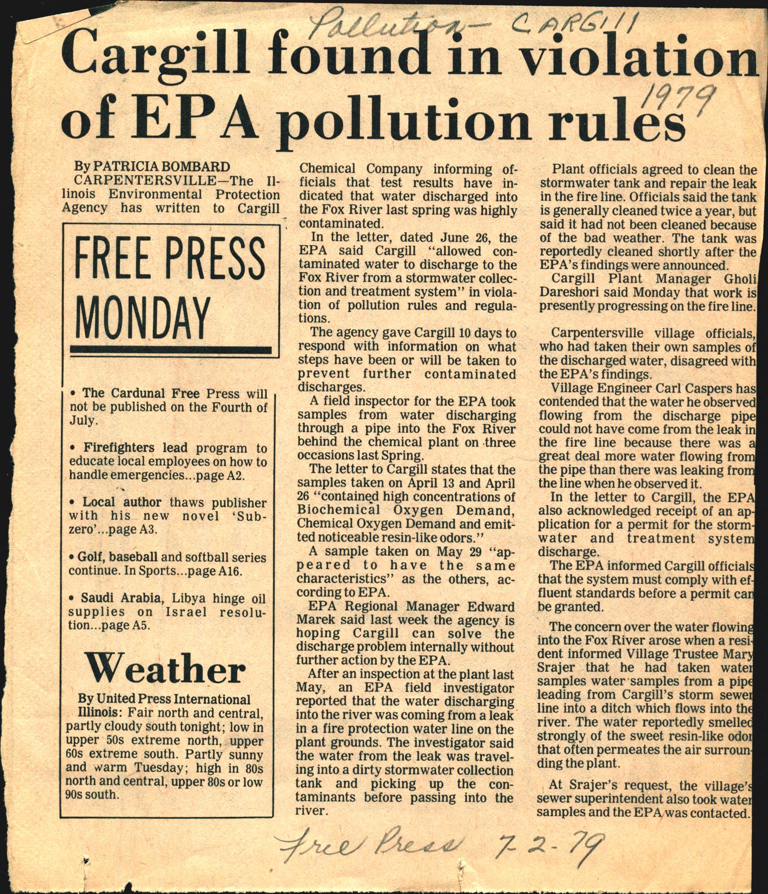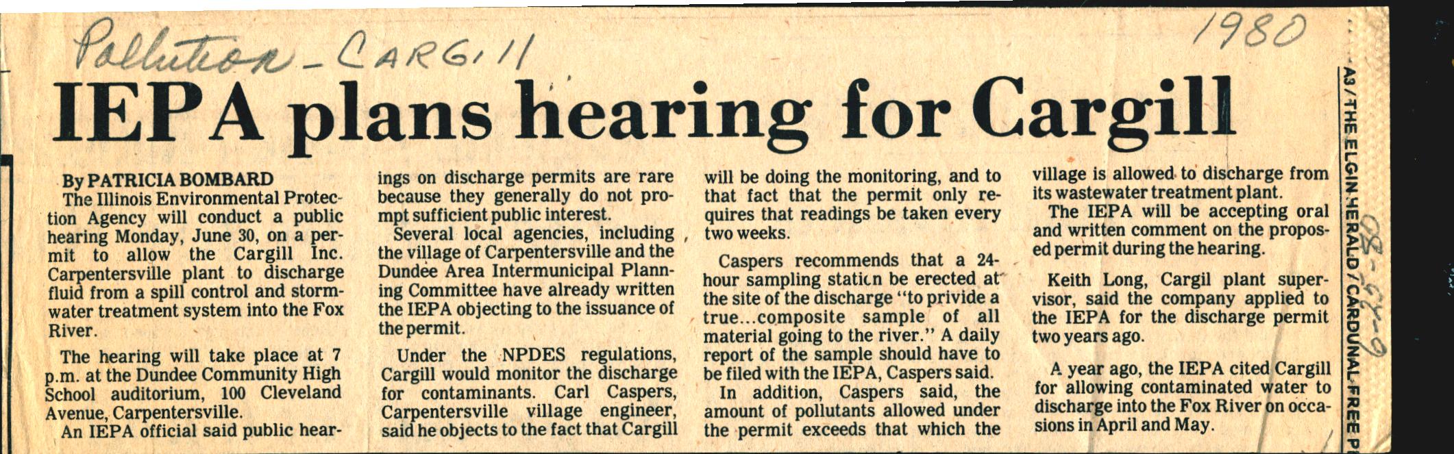 - “IEPA, Cargill Look to Halt Discharge into Fox River”, Cardunal Free Press, May 29, 1981