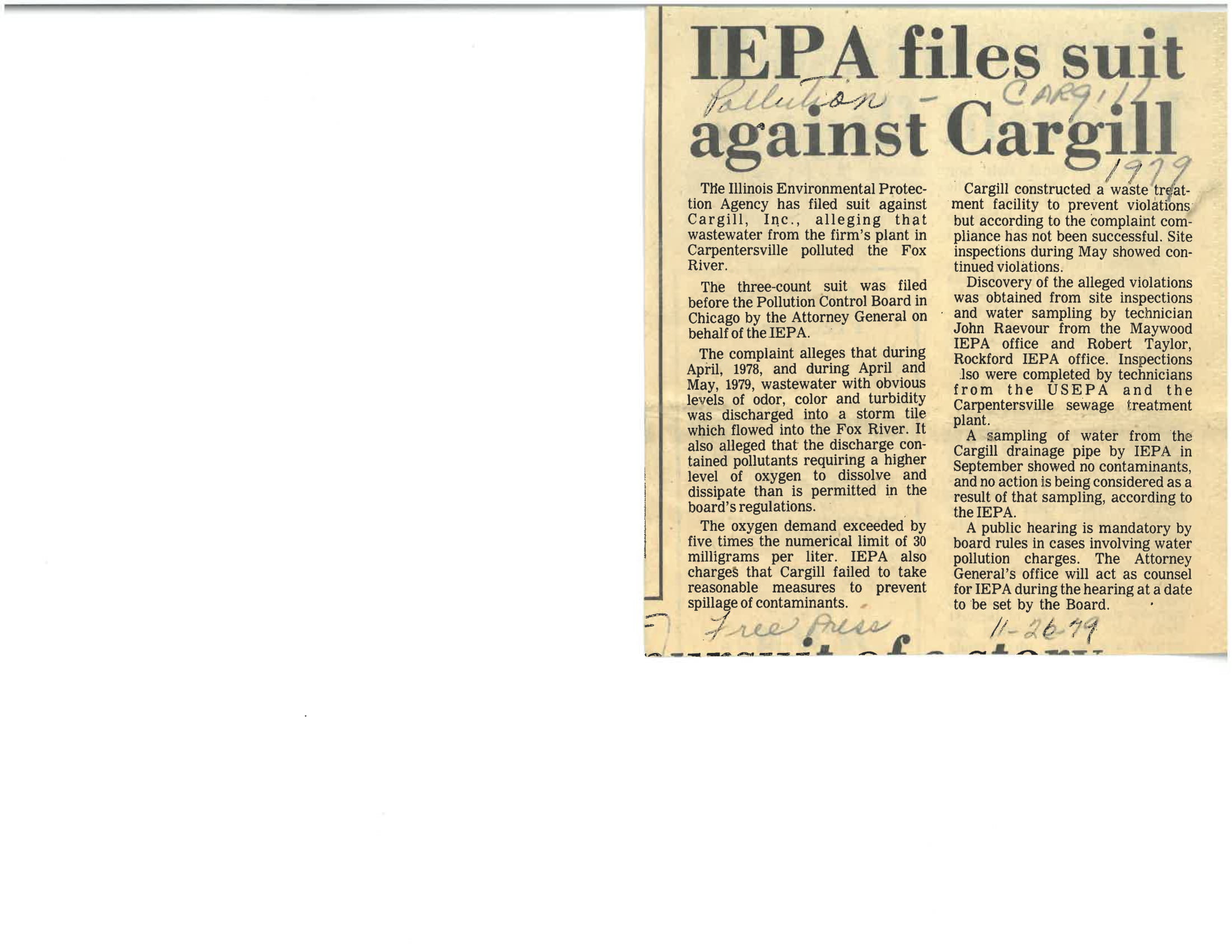 - “IEPA Files Suit Against Cargill”, Cardunal Free Press, November 26, 1979