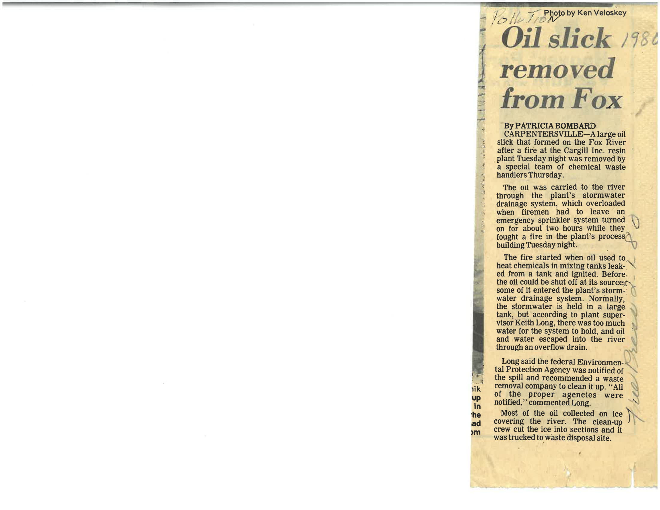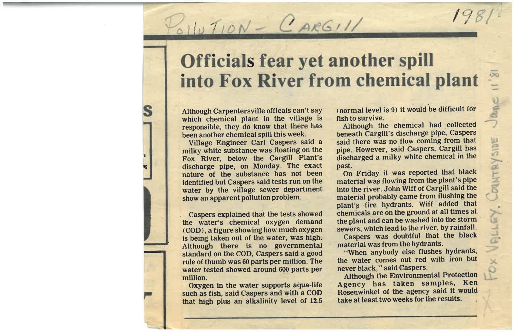 - “IEPA Locates Source of Cargill Discharge”, Fox Valley Countryside, May 10, 1979