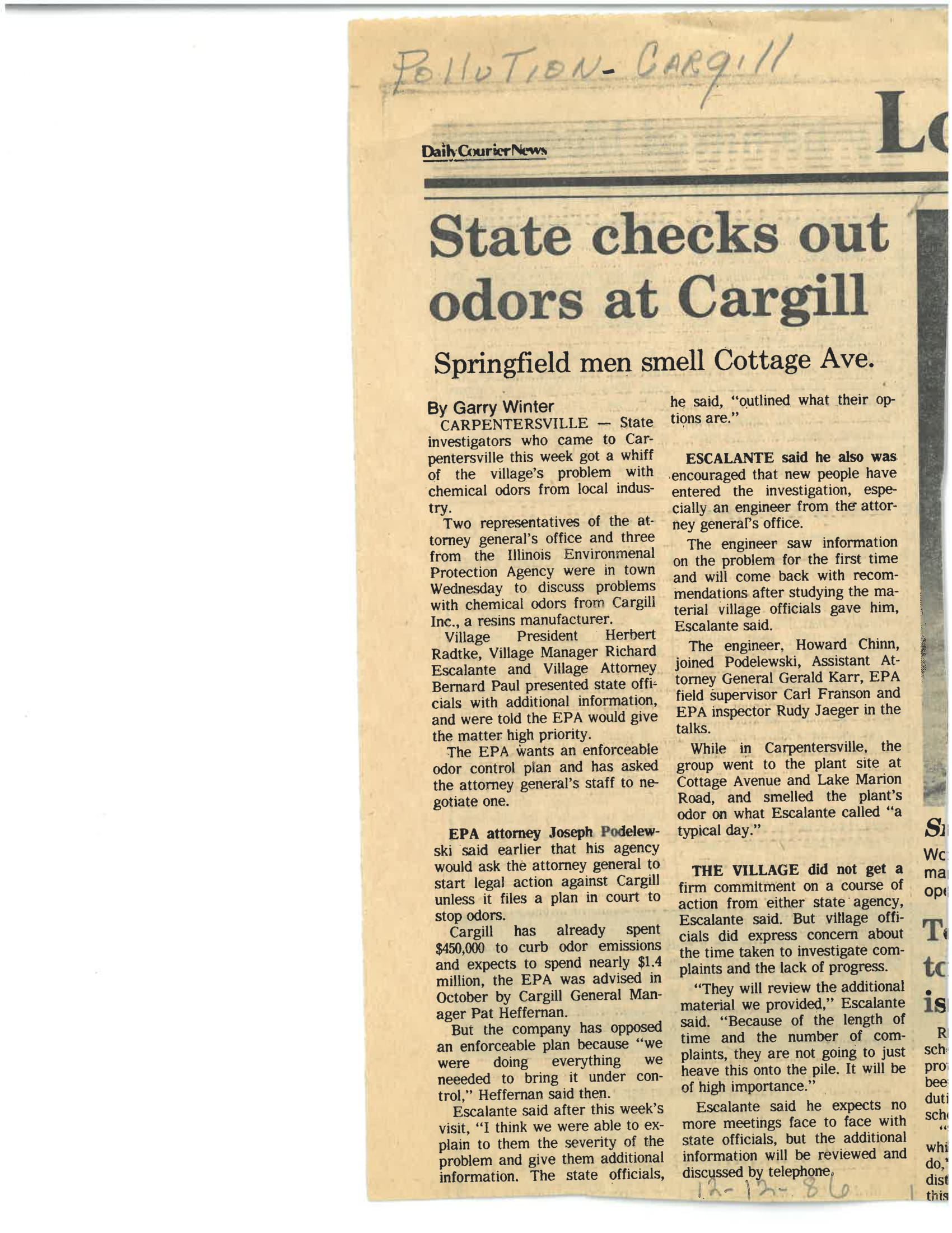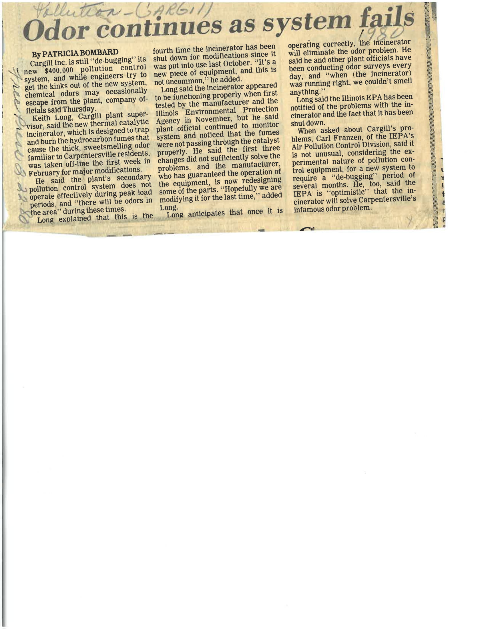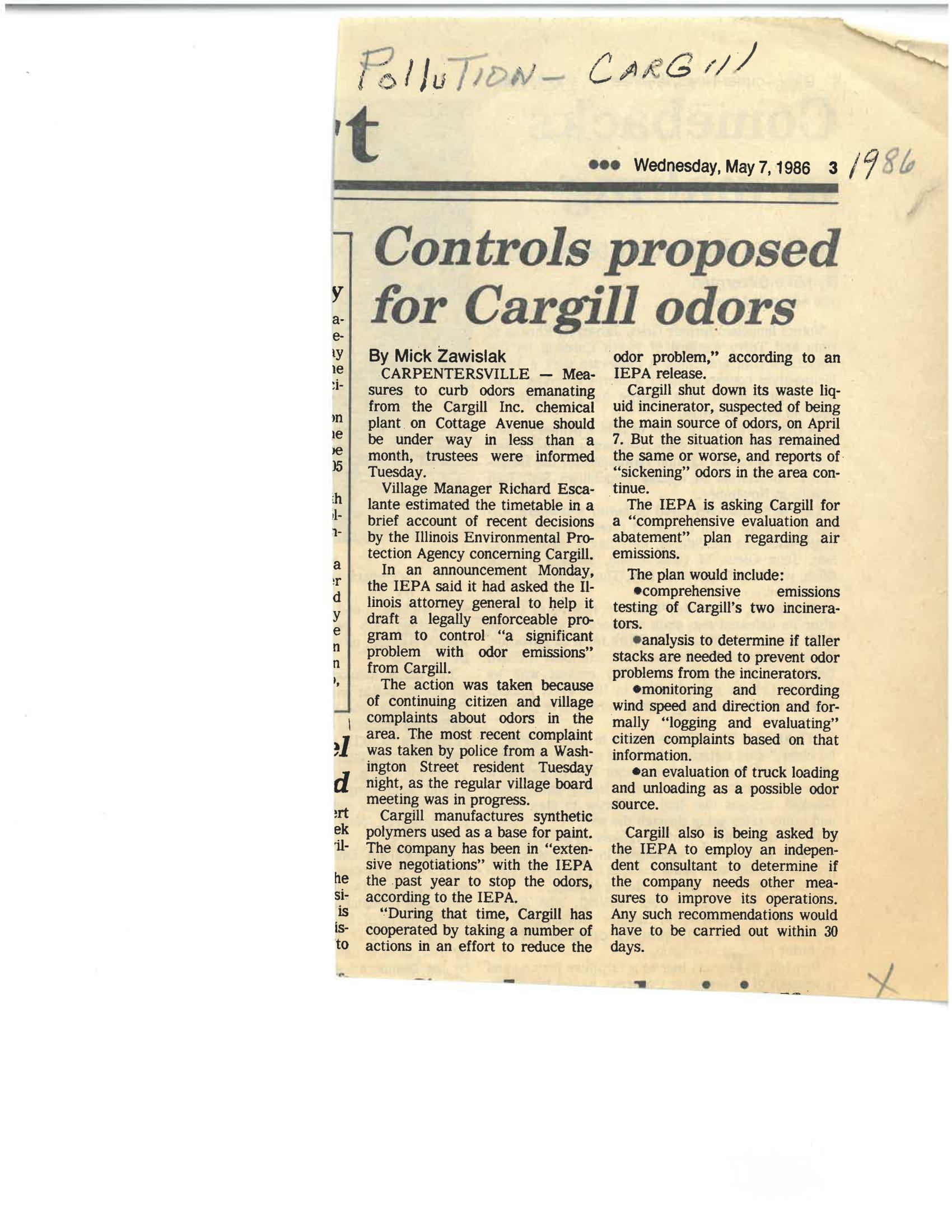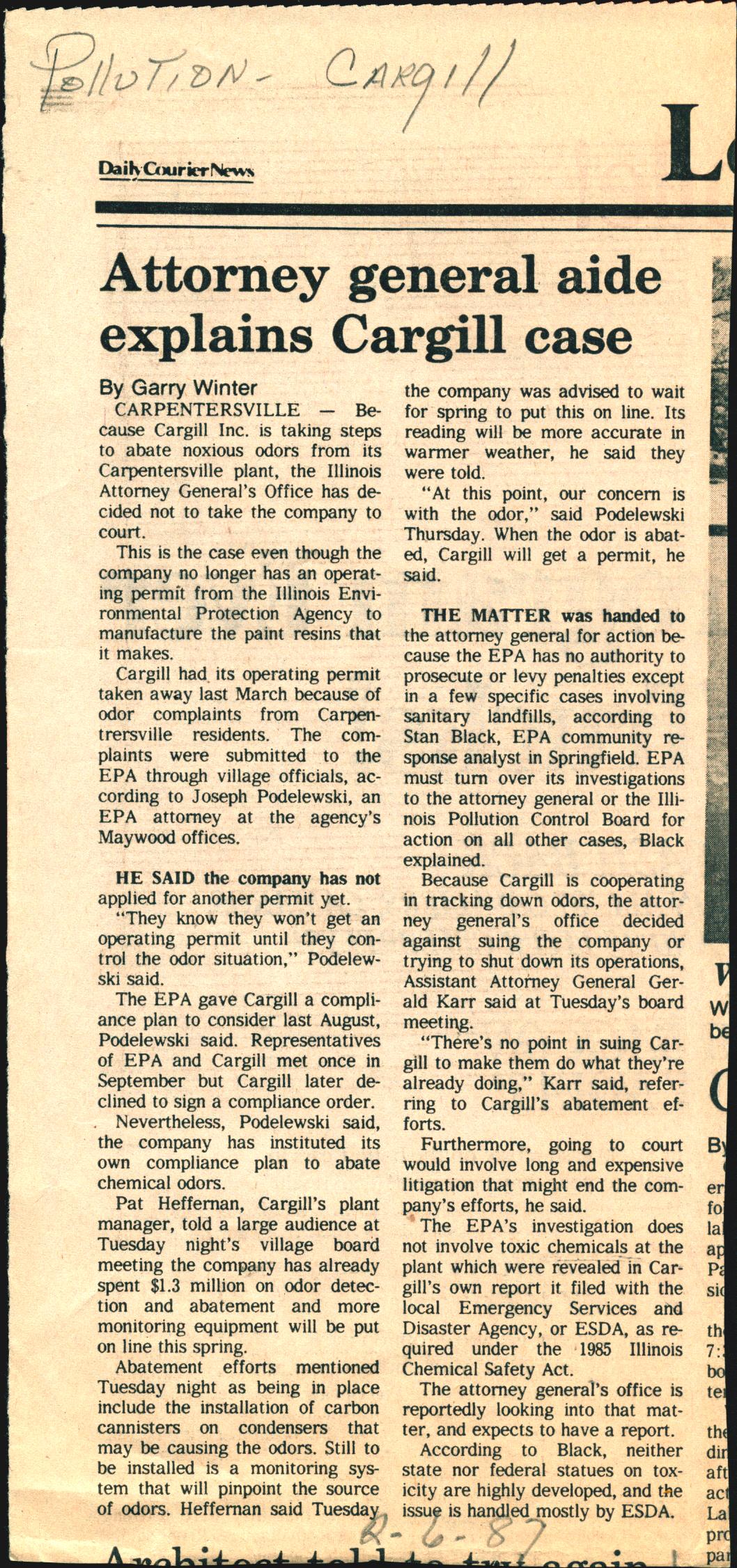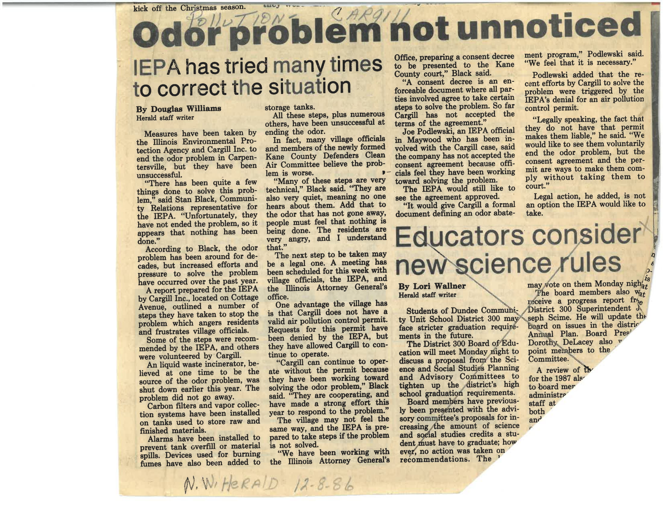 - “Cargill Faces Odor Action” and “Investigation by IEPA Begins”, Northwest Herald, March 27, 1986