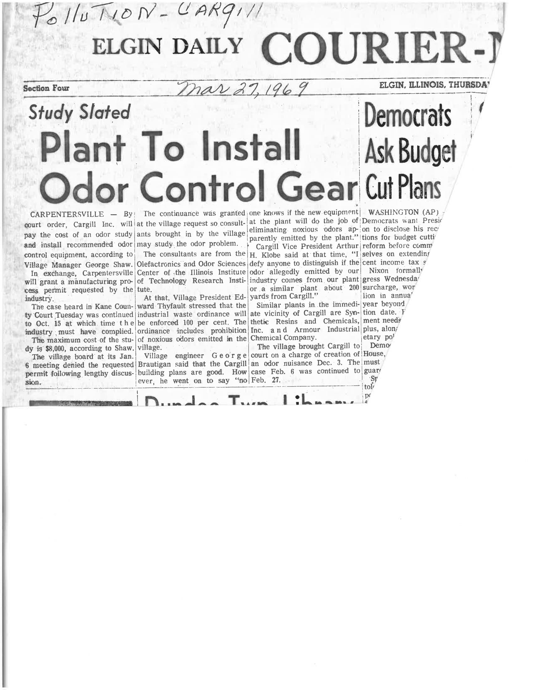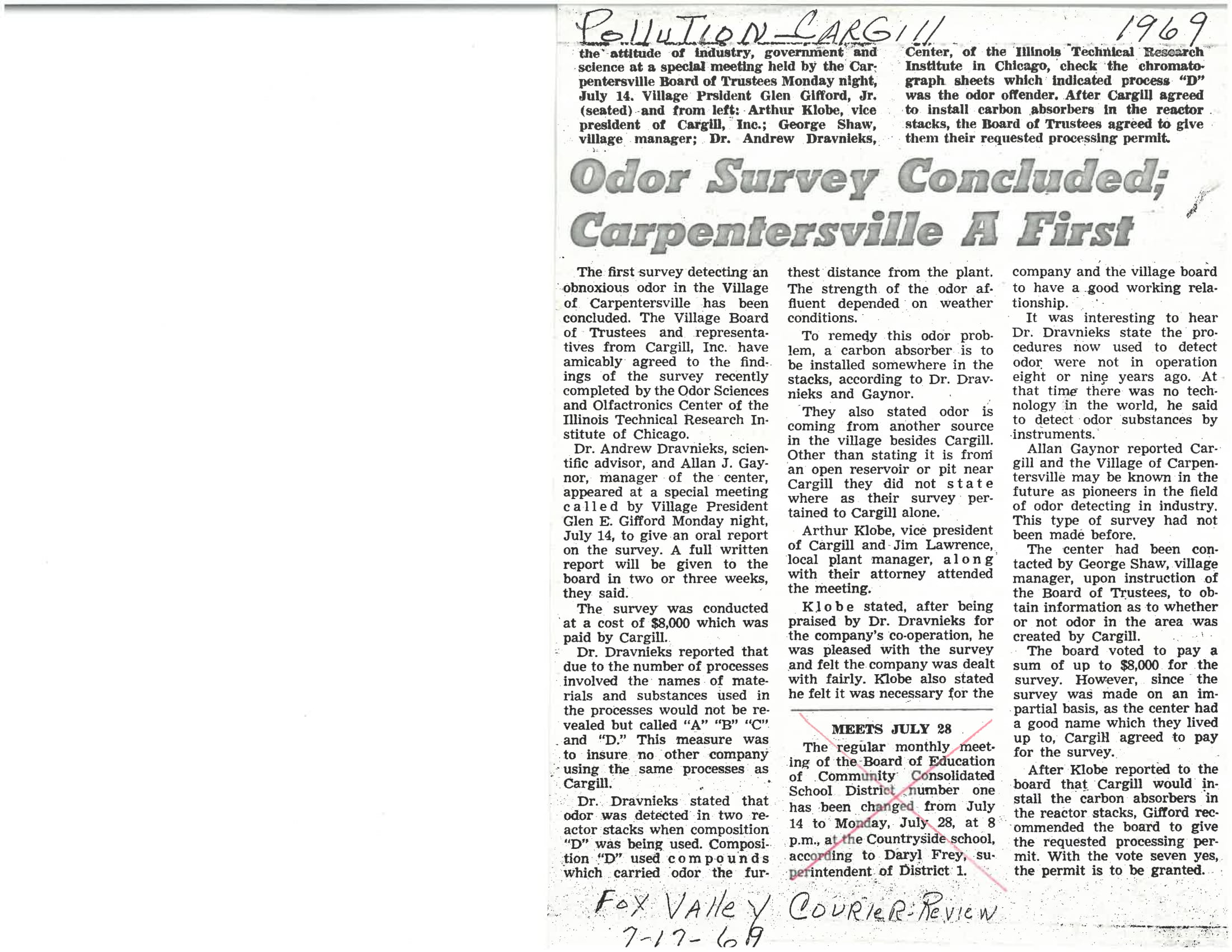 - “Odor Survey Concluded; Carpentersville a First”, Fox Valley Courier Review, July 17, 1969