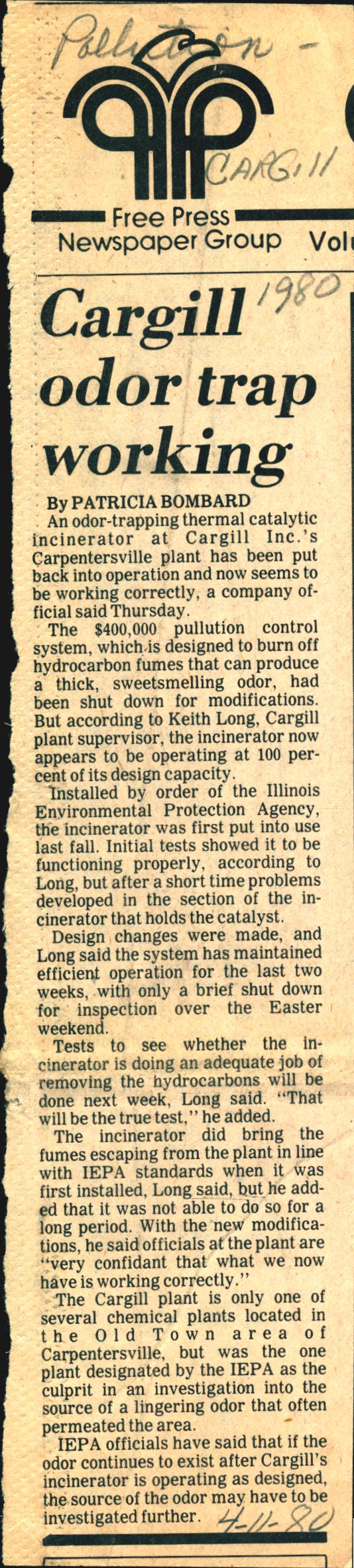 - “Cargill Odor Trap Working”, Cardunal Free Press, April 11, 1980