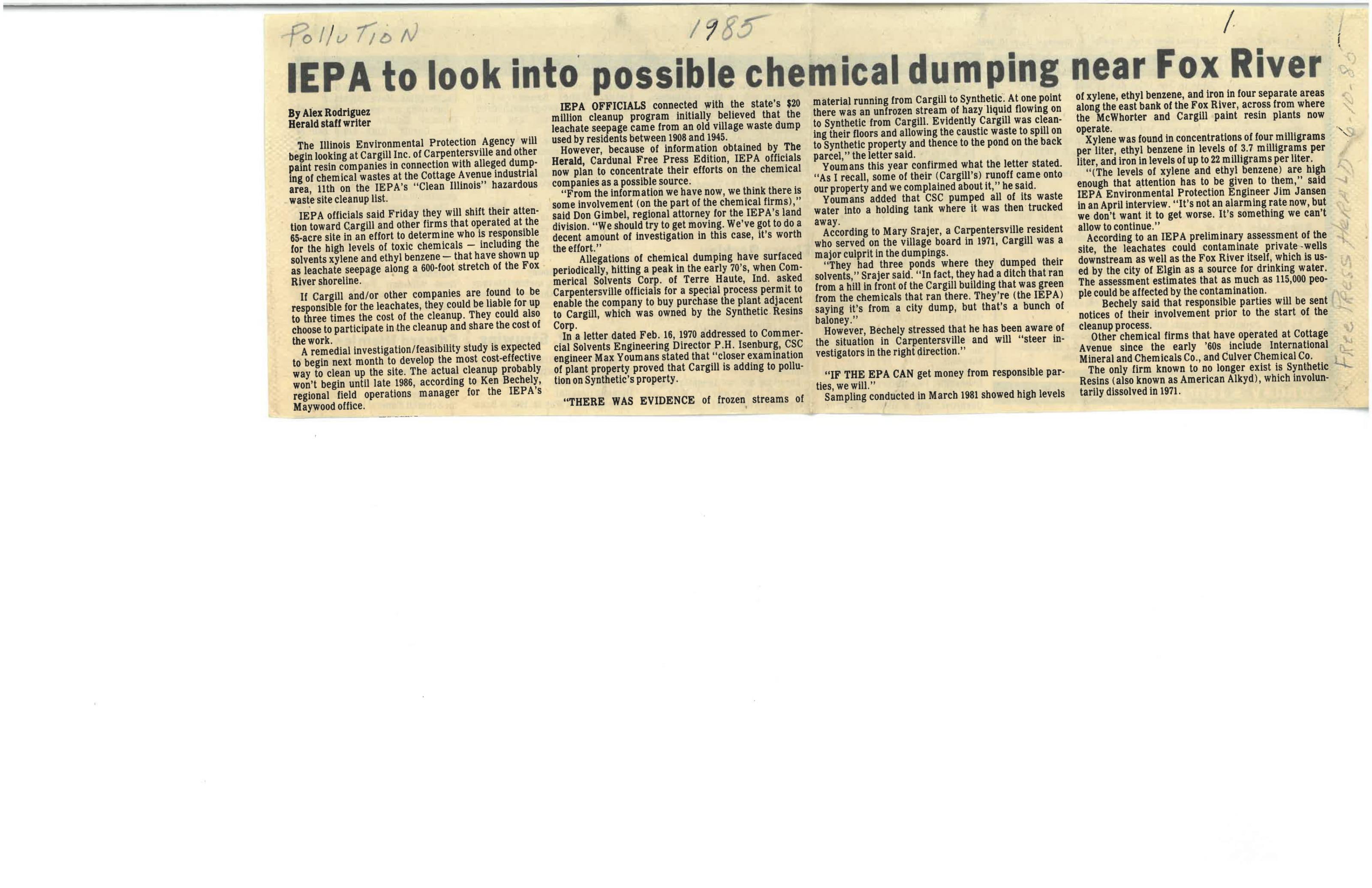- “IEPA to Look into Possible Chemical Dumping Near Fox River”, Cardunal Free Press, June 10, 1980