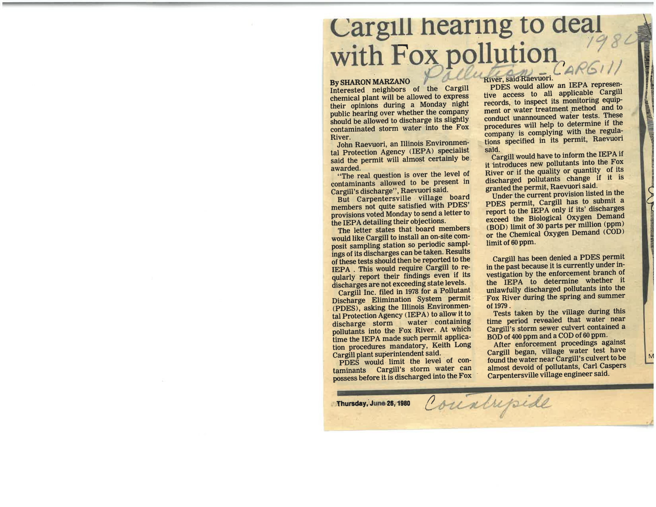 - “Cargill Hearing to Deal With Fox Pollution”, Fox Valley Countryside, June 26, 1980
