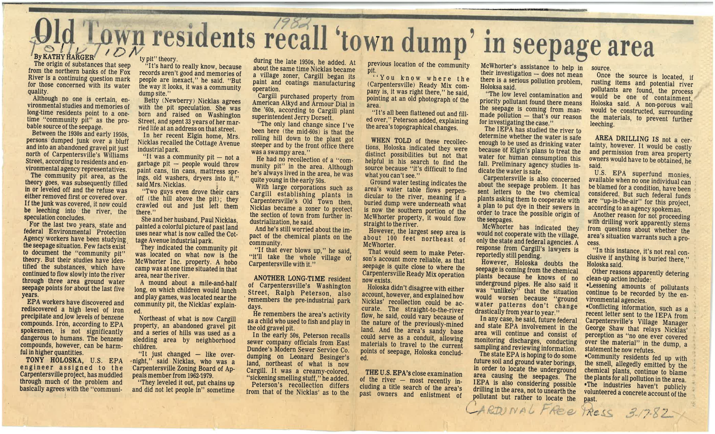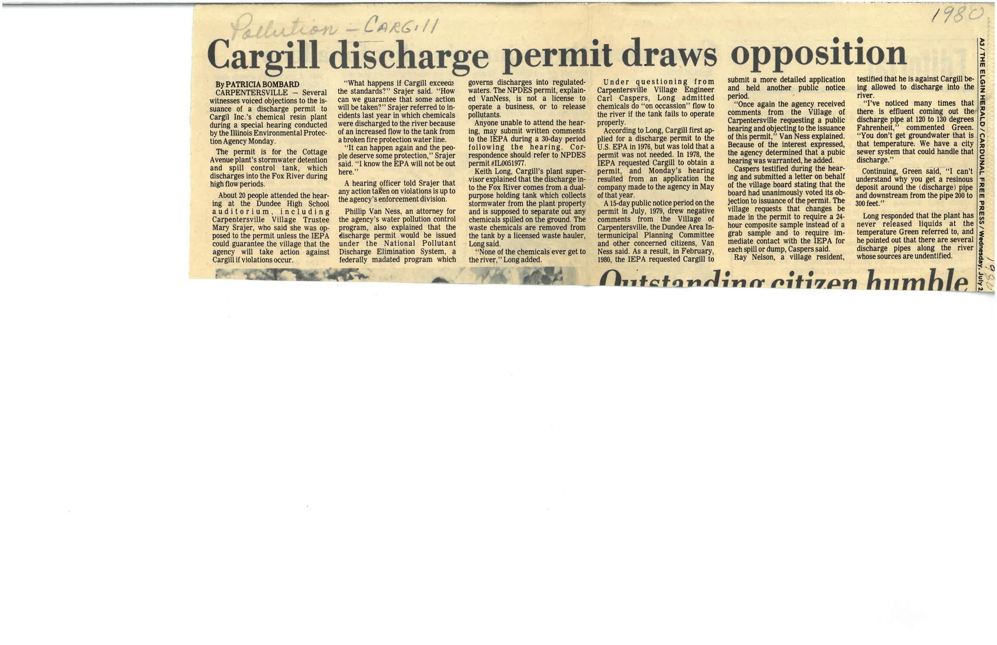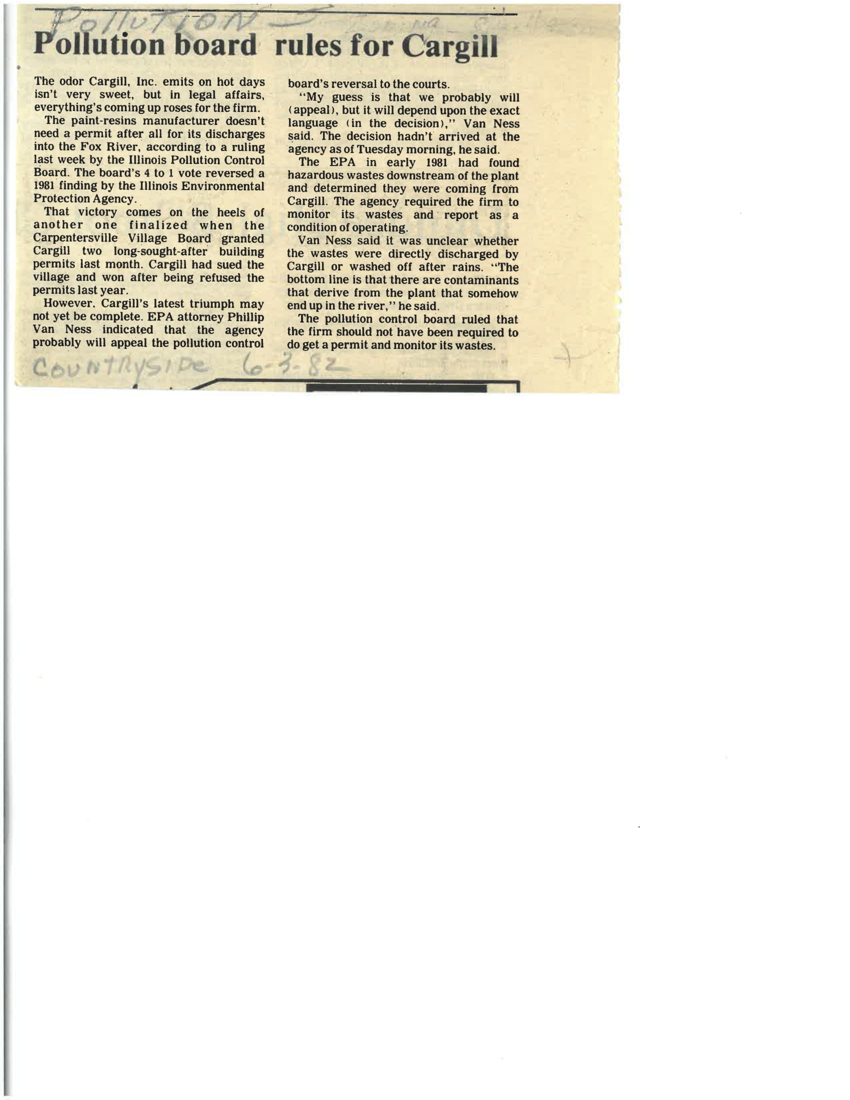 - “Pollution Board Rules for Cargill”, Fox Valley Countryside, June 3, 1982