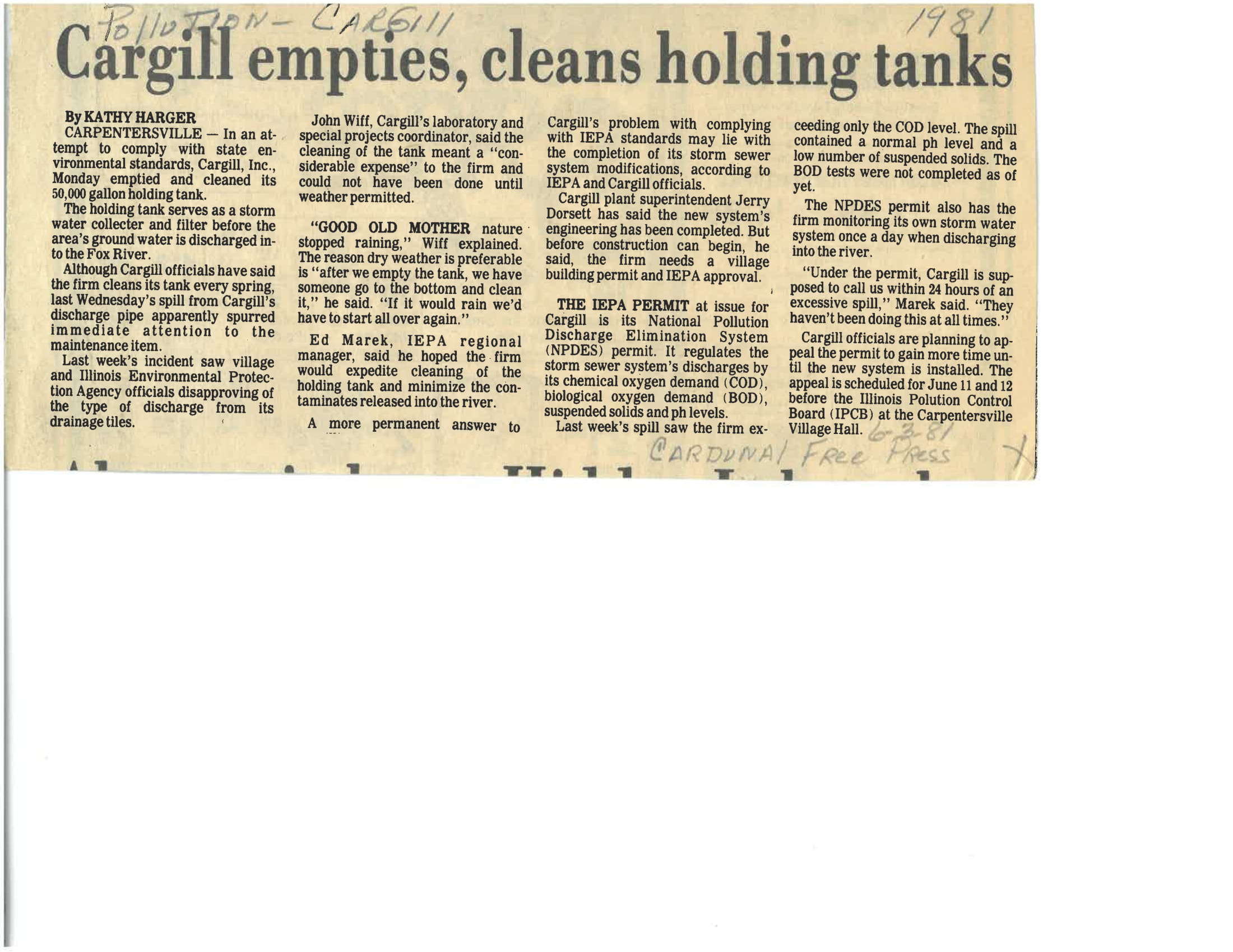 - “Cargill Empties, Cleans Holding Tanks”, Cardunal Free Press, June 3, 1981