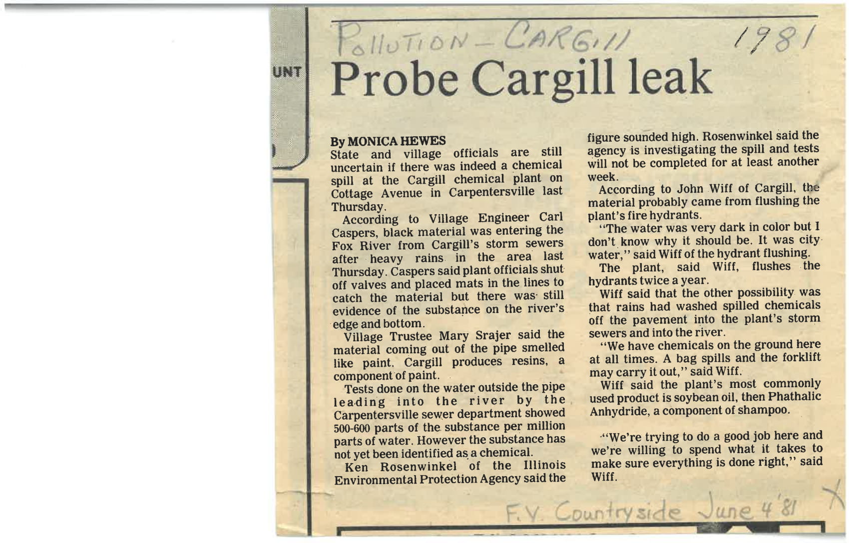 - “Probe Cargill Leak”, Fox Valley Countryside, June 4, 1981