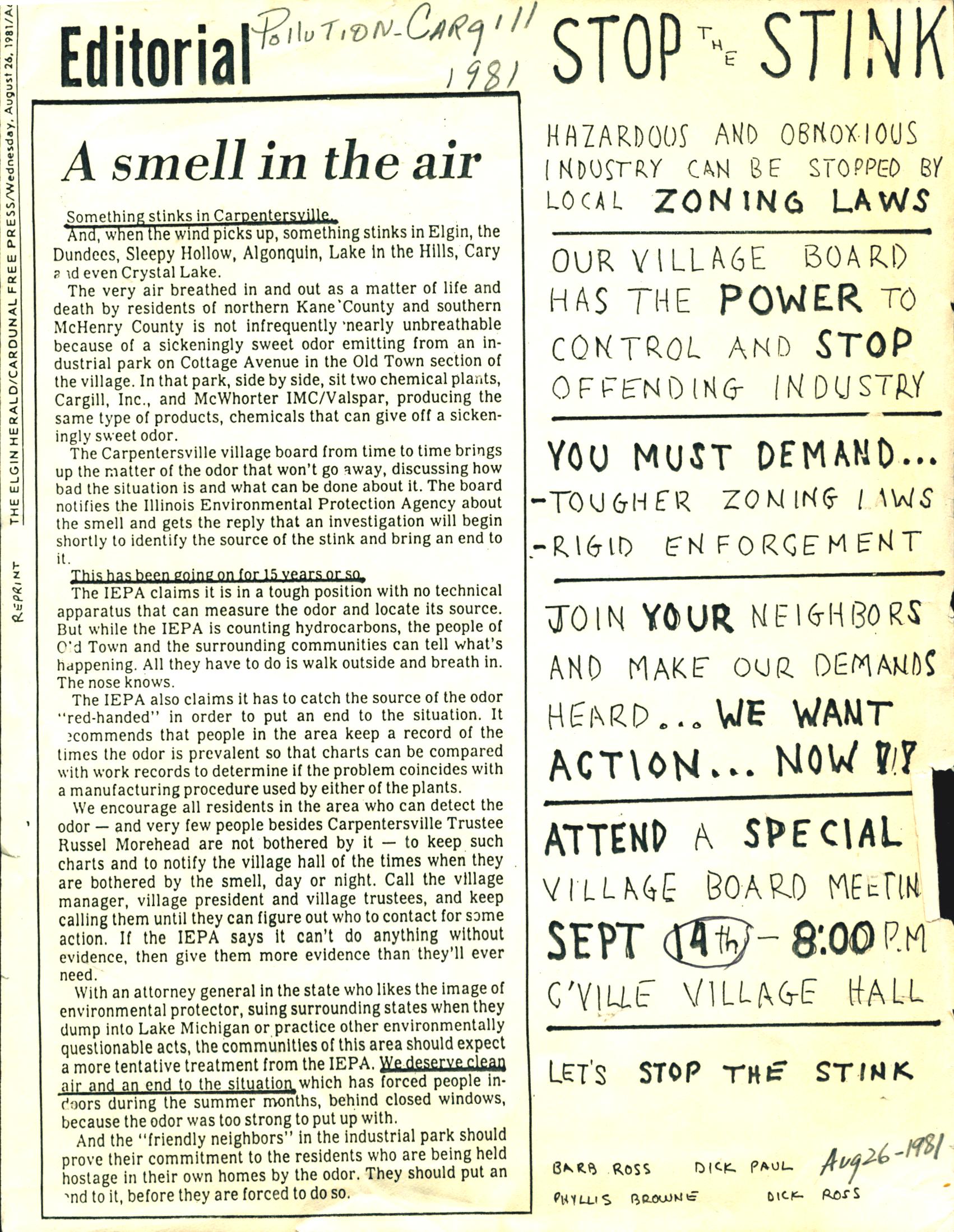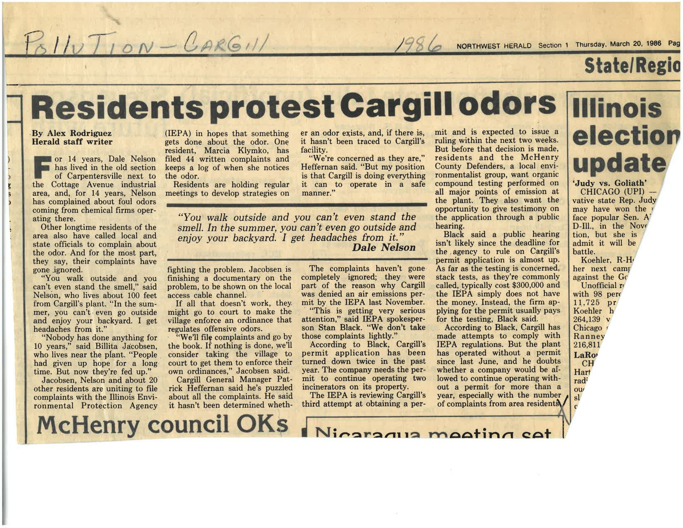 - “Residents Protest Cargill Odors”, Northwest Herald, March 20, 1986