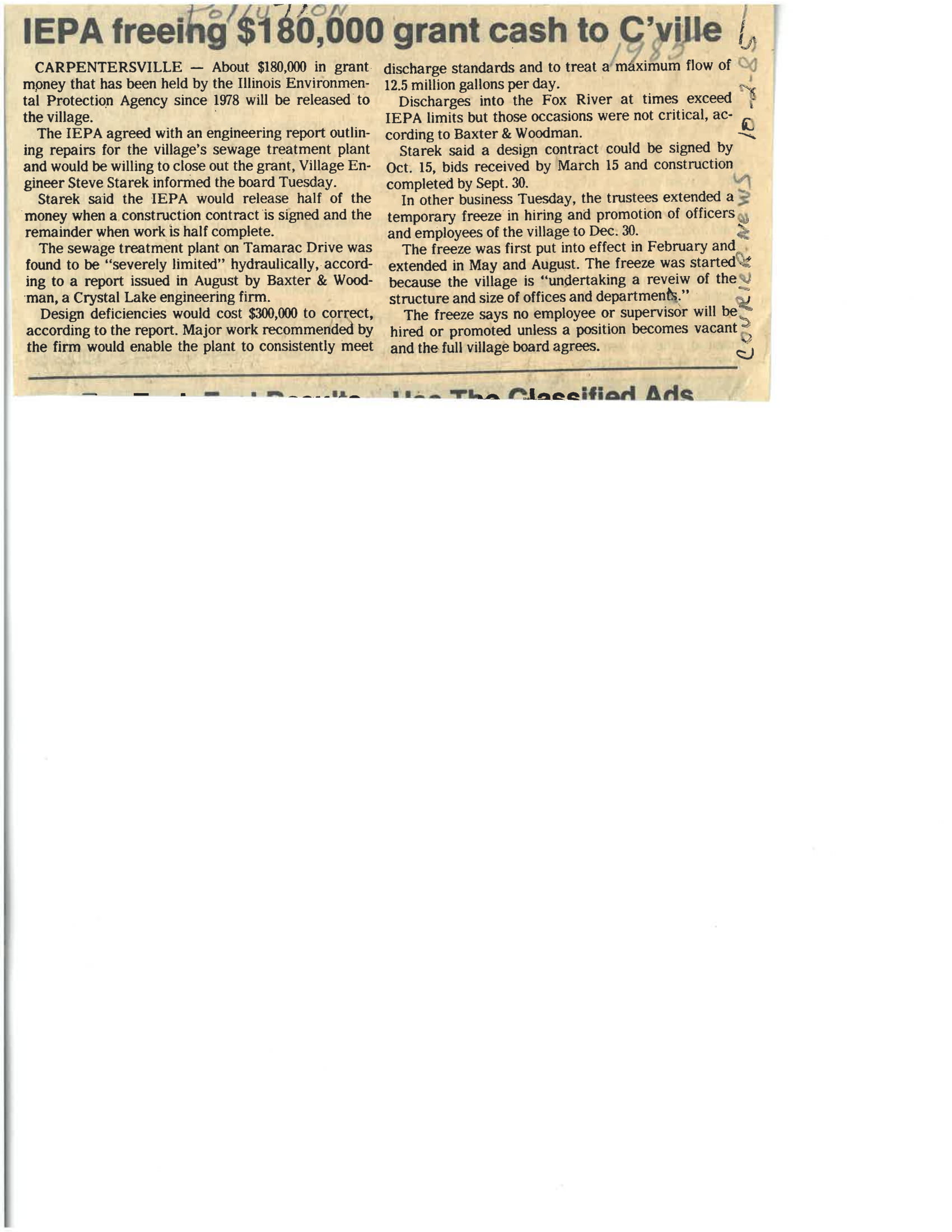 - “IEPA Freeing $180,000 Grant Cash to C’ville”, Courier News, October 2, 1985