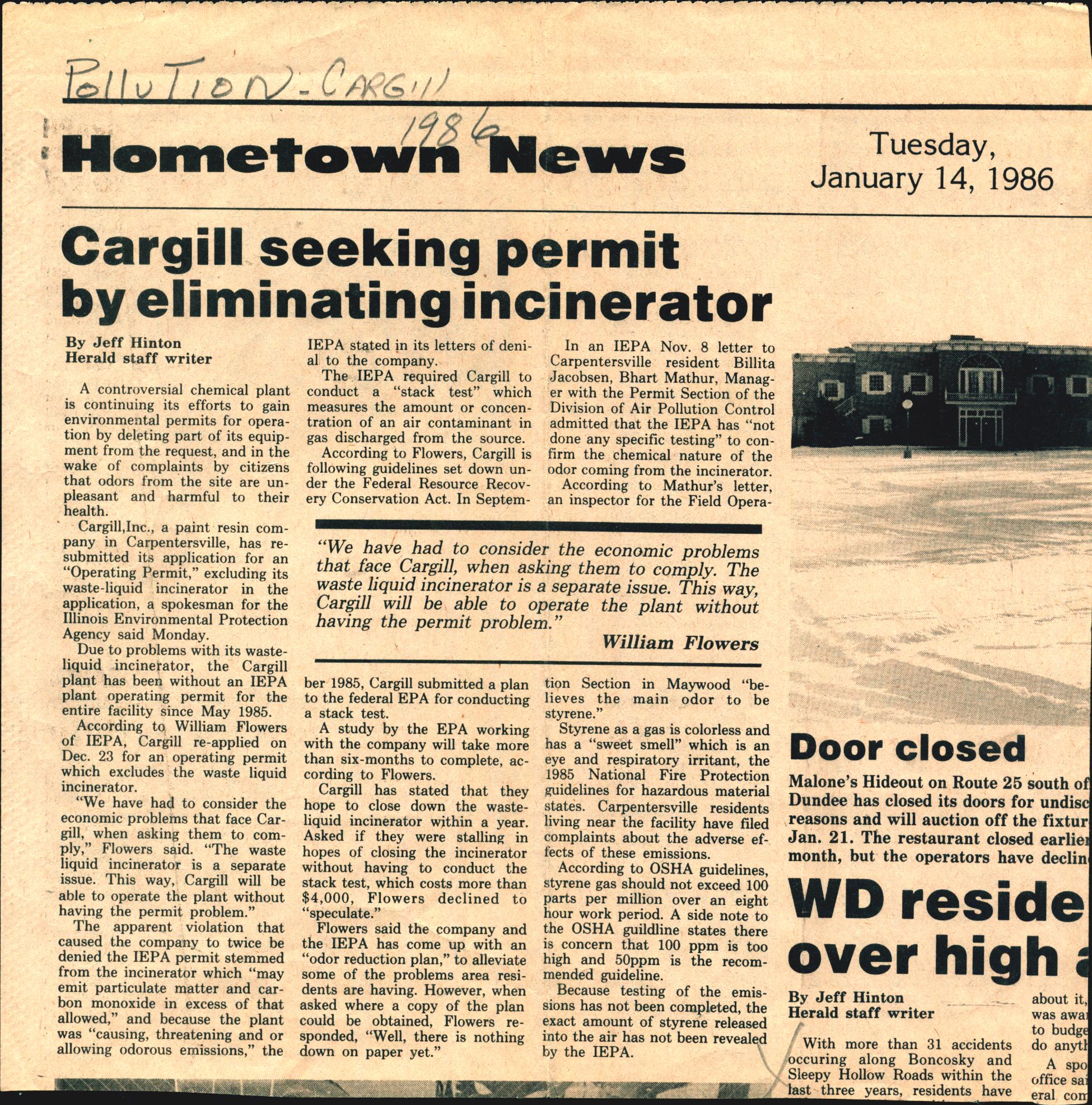 - “Cargill Seeking Permit by Eliminating Incinerator”, Northwest Herald, January 14, 1986