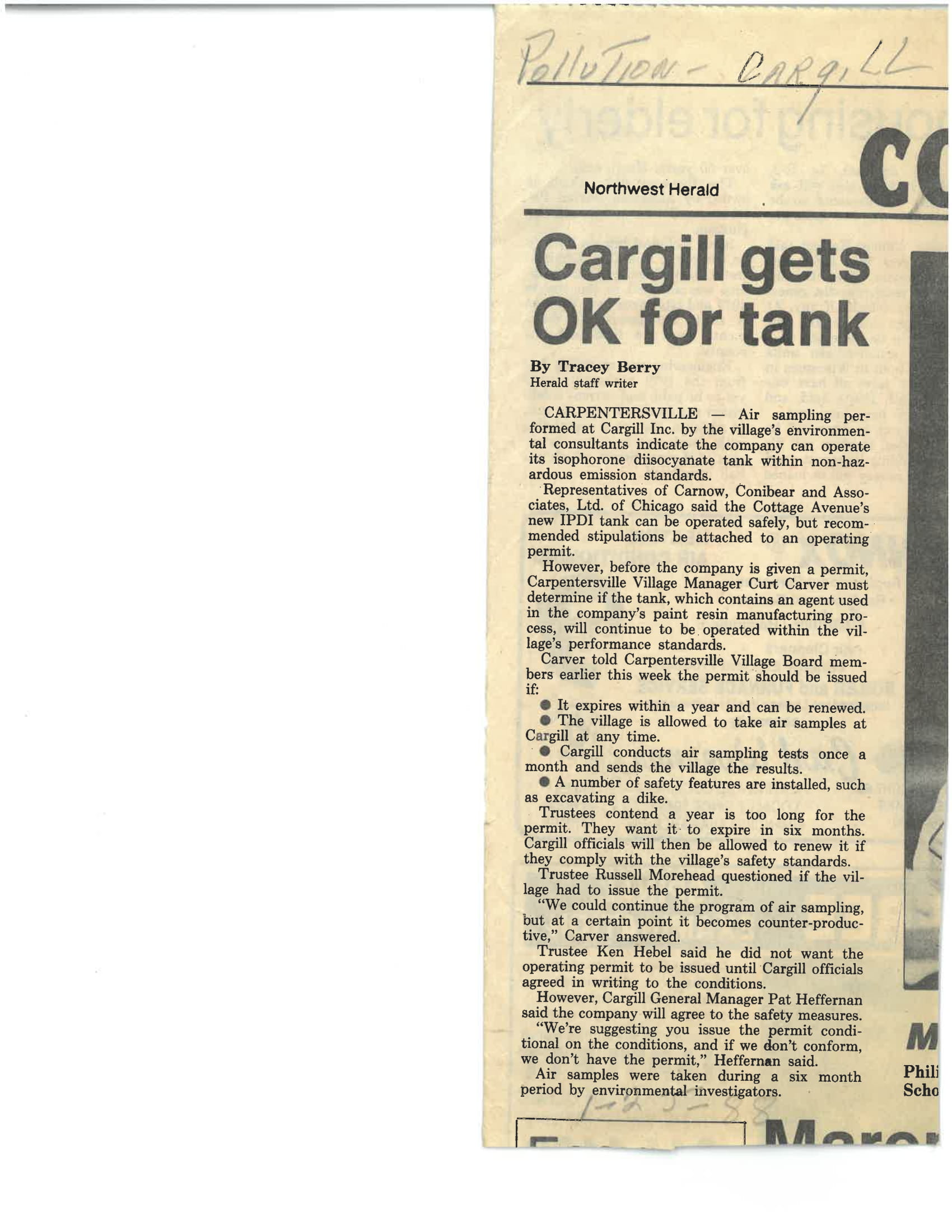 - “Cargill Gets OK for Tank”, Northwest Herald, January 25, 1988