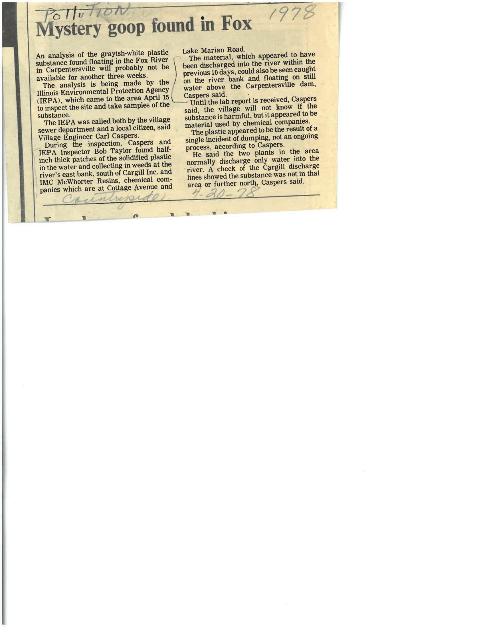 - “Mystery Goop Found in Fox”, Fox Valley Countryside, April 20, 1978